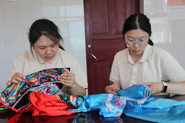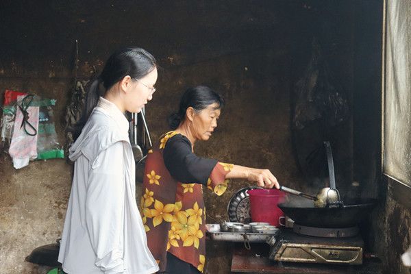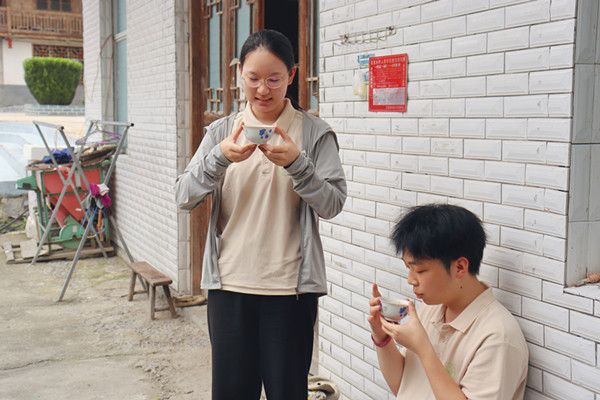 实践团成员在茶园村进行了实地走访,通过与当地村民的交谈了解了当地最具有代表性的民族文化——油茶与苗族服饰,并且在当地村民的邀请下进行了体验。当地村民为实践团成员讲解了苗服的制作工艺以及发展历史,实践团成员得知了苗服承载的是苗族人民对生活的热爱和对生命起源的深刻理解,包含着强烈的民族情感。一位实践团成员表示:“以前我只觉得苗服漂亮精美,没想到其背后竟然有这样深刻的文化意蕴。”除此之外,实践团调研组服装与服饰设计专业成员还结合自身的专业知识,对苗服的面料、工艺、纹样进行了进一步观察与研究,实践团成员身着苗服行走在茶园村的苗族建筑中,融入当地的“苗寨文化”。在了解苗族服饰之后实践团成员还受邀品尝油茶,不仅品味了油茶的特色风味而且了解了油茶的制作过程。
