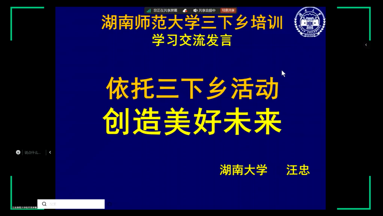 为了帮助学生掌握社会调查研究的方法和技巧,7月7日,校团委特邀湖南大学工商管理学院教授汪忠为我校实践团队开展调研技能培训。汪忠以“依托三下乡活动,创造美好未来”为题,围绕“依托三下乡创造美好人生”、“三下乡促进生涯与创新创业的途径”、“基于三下乡生涯发展创业的行政案例”三个方面进行了精彩分享。讲座还设置互动环节,与会同学积极提问,线上交流氛围良好。