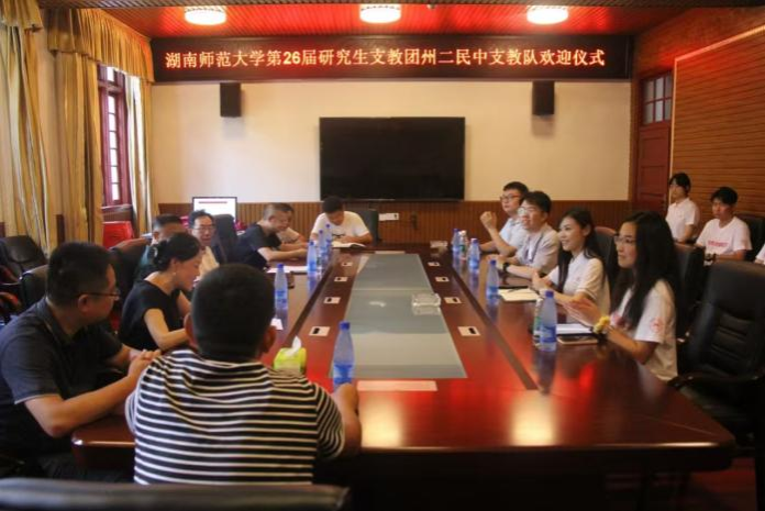 (通讯员 陈嘉鑫 胡琼燕)8月22日下午,太阳成集团tyc第26届研究生支教团抵达服务地湘西自治州第二民族中学(以下简称“州二民中”),并于该校和平楼二楼会议室参加见面会。我校团委青年发展部主任周子杨与挂职副书记邓郭欢、王纪海、于沛鑫带队随行,州二民中党委书记田正富、校长陈俊、纪委书记彭艳萍与办公室、教务科、学生科、后勤科等相关负责人出席会议。