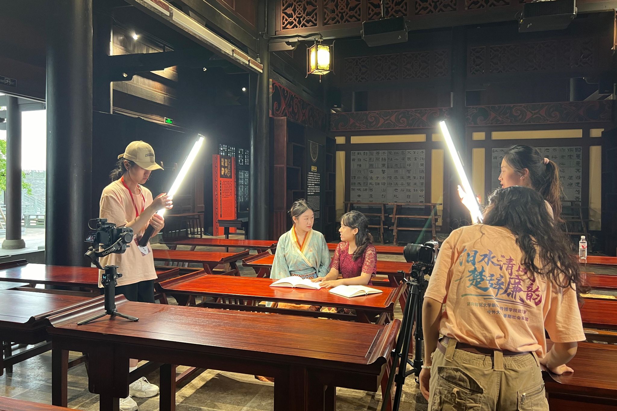屈子书院是目前中国国内最大的榫卯结构穿斗式全木仿古建筑,由求索堂、沅湘堂、独醒楼、悲士亭、沧浪台等19个单体组成。在屈子书院开展拍摄活动,团队成员与中华优秀传统文化近距离接触,感受其跨越时空的精神力量。“朕幼清以廉洁兮,身服义而未沫。”屈子学堂内摆放着古代中式桌椅,印度尼西亚籍研究生坐于其中,提出对于屈原典故的疑惑不解,主持人身着汉服,将其初心娓娓道来。团队成员将屈原的廉洁思想以生动的视觉形式呈现,有利于激发新一代青年人对个人品德和社会伦理的思考。