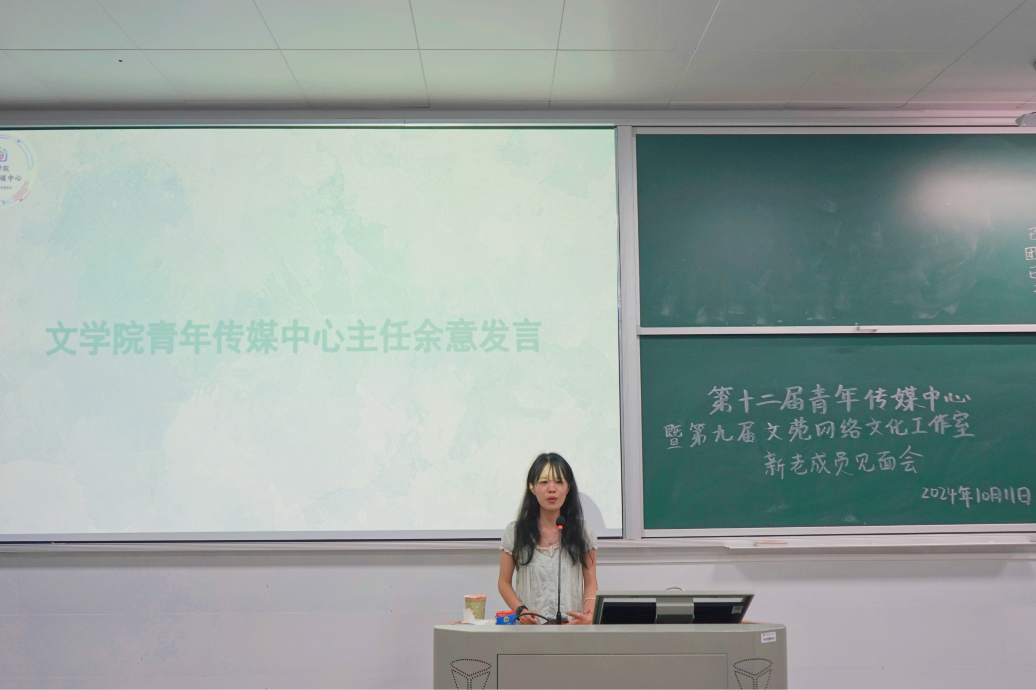 在各成员初步互相了解后,青传主任上台发言。她详细说明了采编部、新媒体部等七大部门的负责内容以及考评标准,并对各部门之间的工作进行了协调安排。她表示,青传是文学院的重要宣传系统,希望青传各成员能团结一心,发挥专业优势,担当好传媒人的职责。