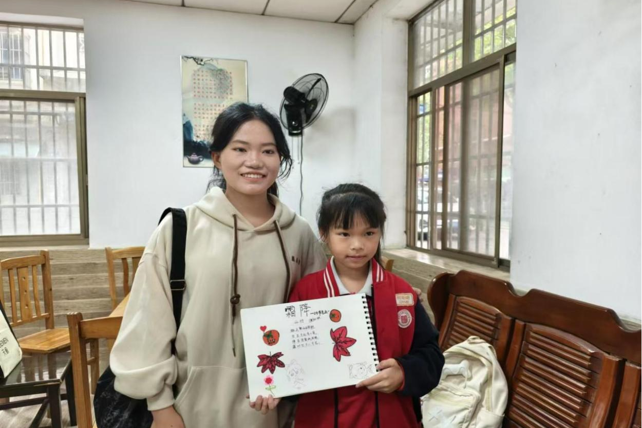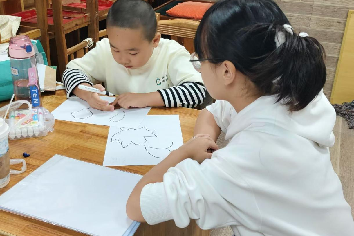 志愿者们为小朋友们准备了A4纸、彩笔等绘制工具,向他们介绍了霜降的气候特点以及其对农业生产的影响,并指导他们绘制霜叶。学生们积极参与,绘制出了一幅幅具有丰富想象力的霜叶图画,色彩的充分运用展现了他们对自然美的欣赏能力。同时,志愿者还借助杜牧“停车坐爱枫林晚,霜叶红于二月花”的诗句,增强小朋友们对霜降节气自然景观变化的感知与理解。志愿者们表示在此次活动中深刻体会到了志愿服务的乐趣,他们将持之以恒地投身于志愿活动,为推动区校共建贡献自己的力量。