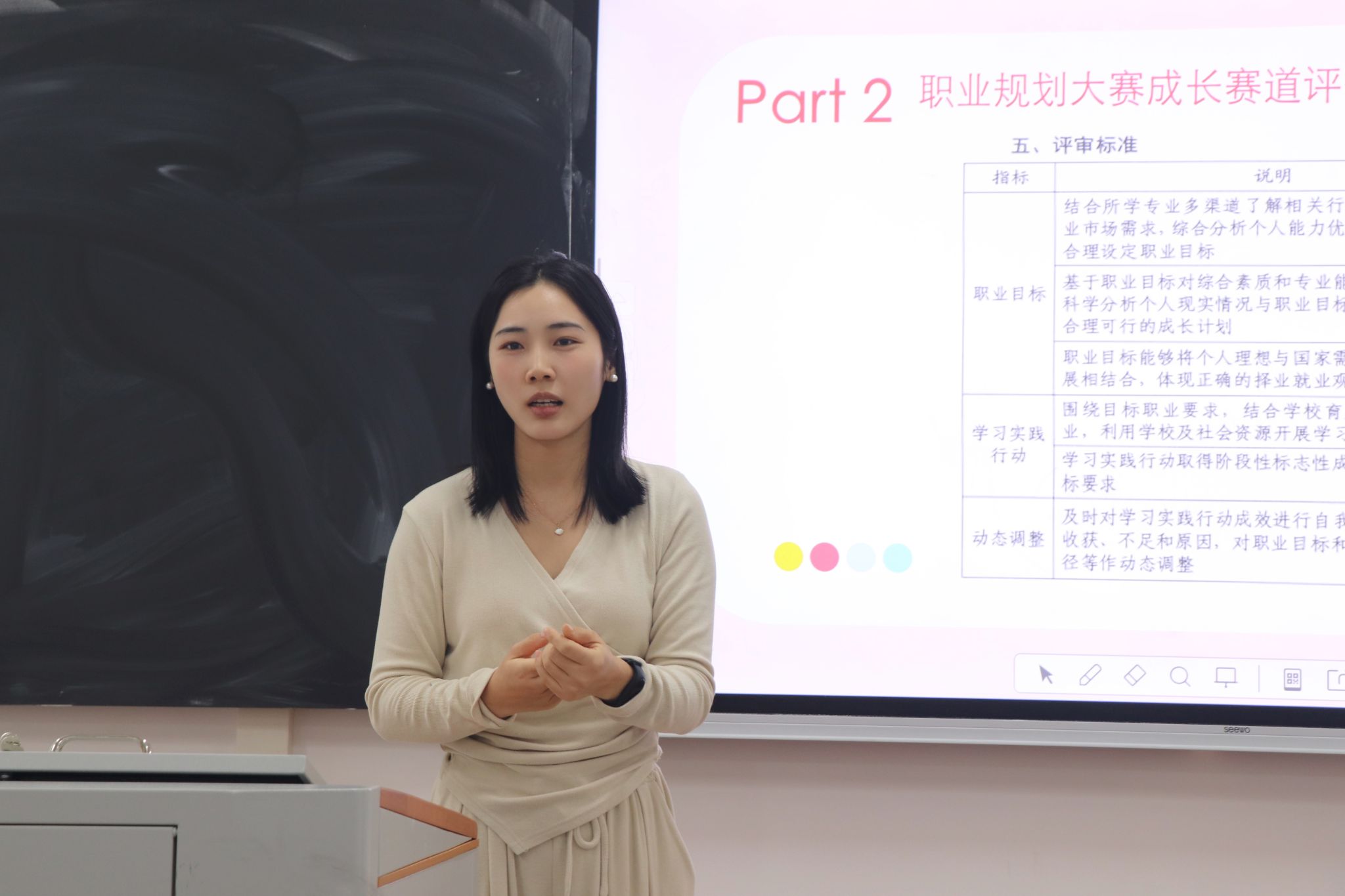 活动围绕“我是谁,我的出路在哪里”这一主题,分为近期大学学习生活答疑解惑、全国大学生职业规划大赛成长赛道参赛指导及交流讨论等环节。在第一个环节,刘美回答了同学们在近期大学学习生活中遇到的问题。对于全国大学生职业规划大赛,刘美详细介绍了全国大学生职业规划大赛的活动目的和评分细则,并逐一解析了大赛的各个组成部分。她首先阐述了职业目标的设定,包括目标的来源和设定过程。随后,她进一步指导同学们如何根据职业目标与自身条件撰写成长计划,强调了在规划过程中应考虑的关键因素。此外,刘美还着重介绍了学校实践活动的重要性,鼓励同学们在精进学业的同时,积极参与各类实践活动,以提升自身的综合素质。在活动的最后部分,刘美引导同学们进行反思,建议他们根据前期设定的职业目标与后期实际发展的情况,及时评估自身与目标的差距,并进行动态调整,以确保职业规划的准确性和可行性。