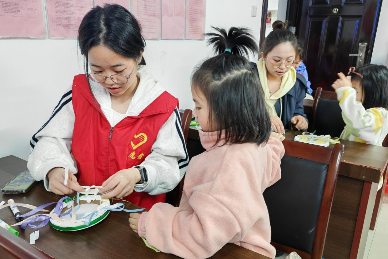 志愿者和小朋友共同制作铃鼓