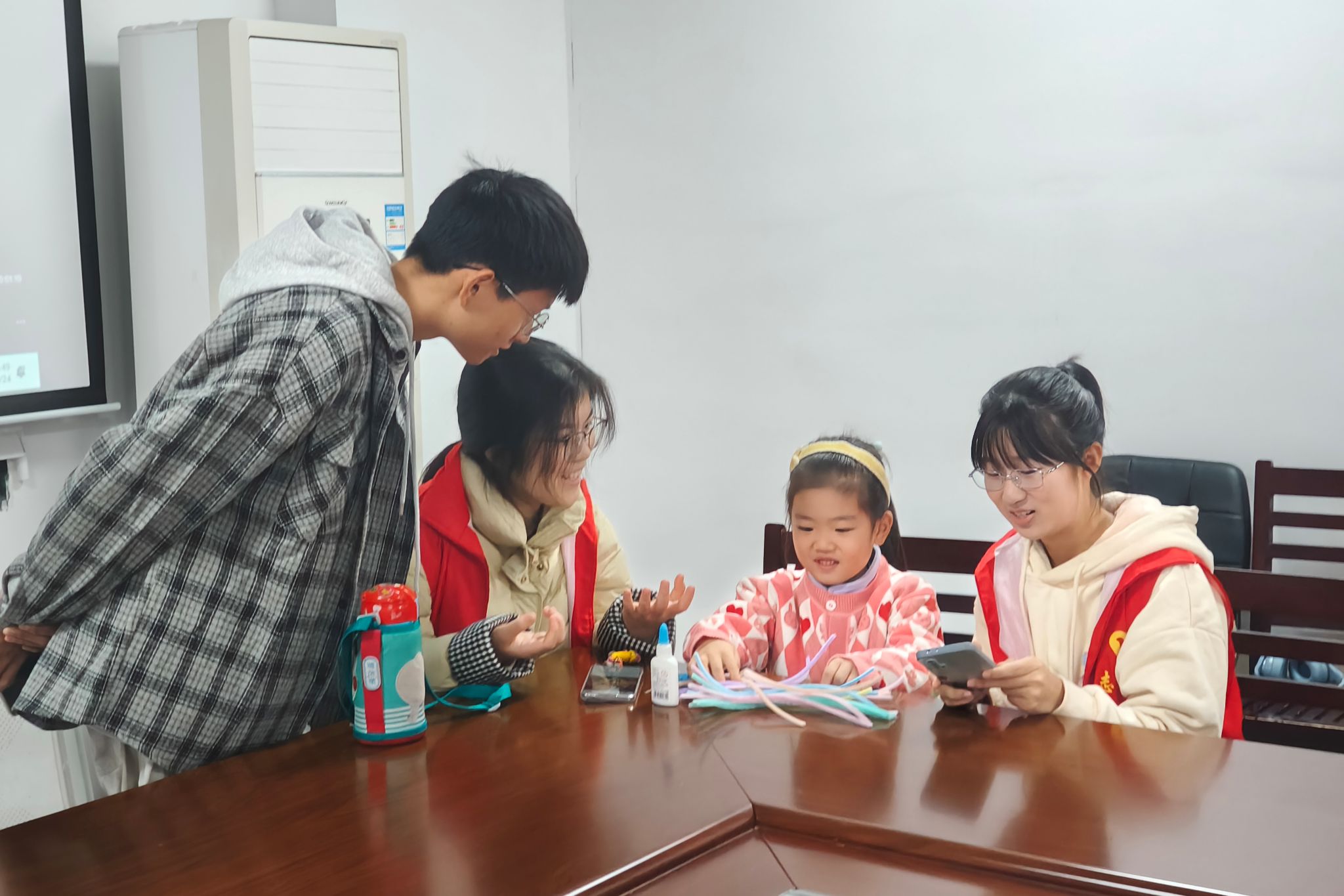 志愿者与小朋友观看教程并制作绒花