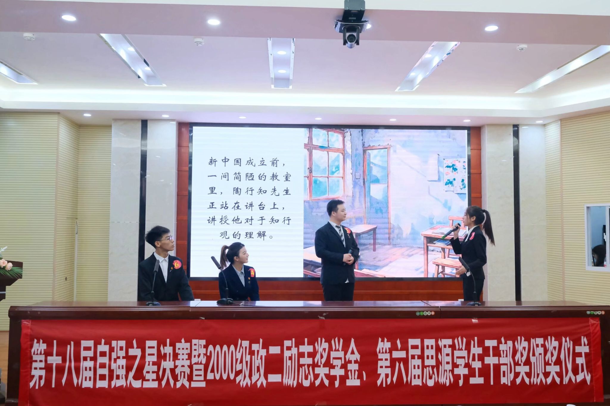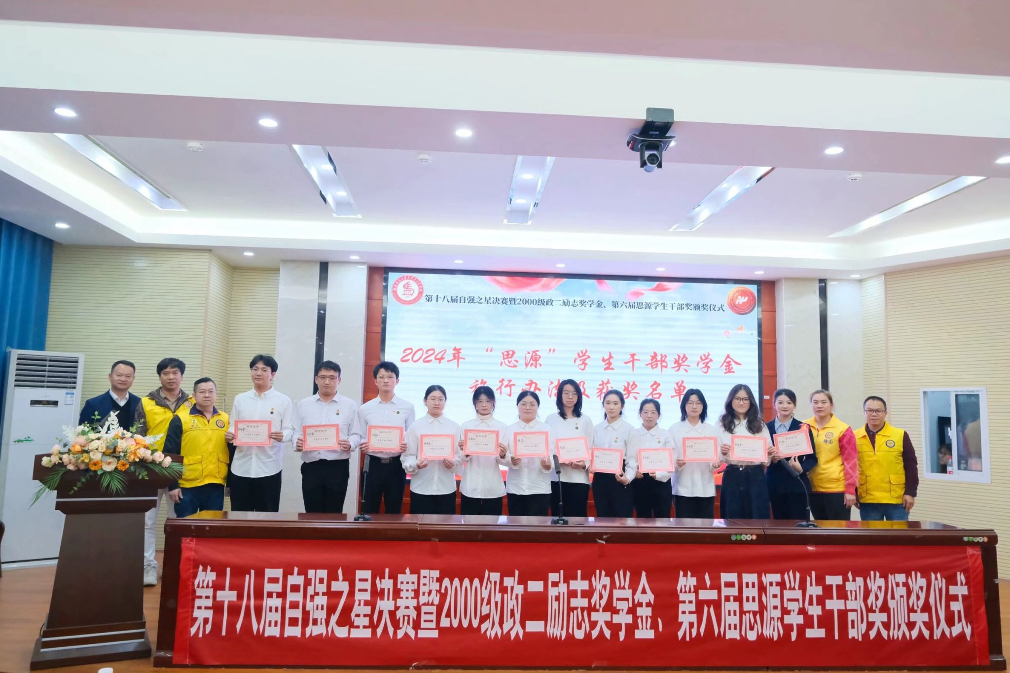 进入颁奖环节,狮子会代表董严宣读了2024年“2000级政教二班”励志奖学金获得者名单,主持人宣读了第十八届“自强之星”演讲比赛决赛获奖名单,包括5名“自强之星”、3名“优秀自强之星”和1名“最佳表现奖”。此外,喻晓坤宣读了2024年思源干部奖施行办法及获奖名单。学院领导、社会爱心助学人士、校友嘉宾为获奖者颁奖,2024年“2000级政教二班”励志奖学金的获得者们,“自强之星”、“优秀自强之星”、“最佳表现奖”的获得者们和第六届思源学生干部奖学金获得者们依次上台领奖。活动最后,领导、嘉宾、评委、参赛选手和受资助学生在景德楼前合影留念。