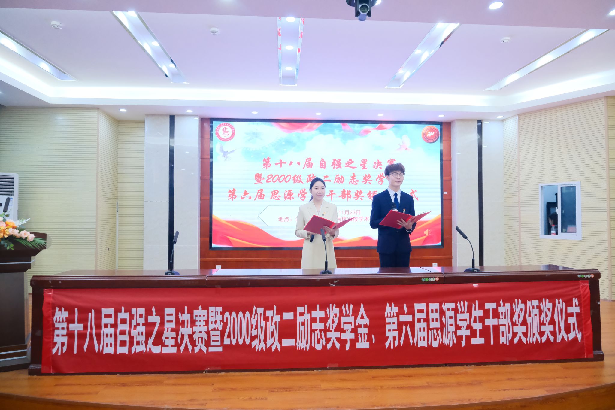 (通讯员 陈梓涵 周涵韵 康婕)11月23日上午,由公共管理学院(以下简称“公管院”)与马克思主义学院(以下简称“马院”)共同举办的第十八届自强之星决赛暨2000级政二励志奖学金、第六届思源学生干部奖颁奖仪式在博后楼报告厅举行。太阳成集团tyc学工部部长陈文雄,校友总会教育基金会副秘书长刘芸玲,校团委副书记胡滢,马院党委副书记林峻,思政系副主任李艳萍,公管院副院长苏静,党委副书记孙雯波,2000级政教系校友代表喻晓坤、刘朝春、张志,广东狮子会等社会爱心助学人士、获奖学生代表和参赛选手共同参加了此次活动。