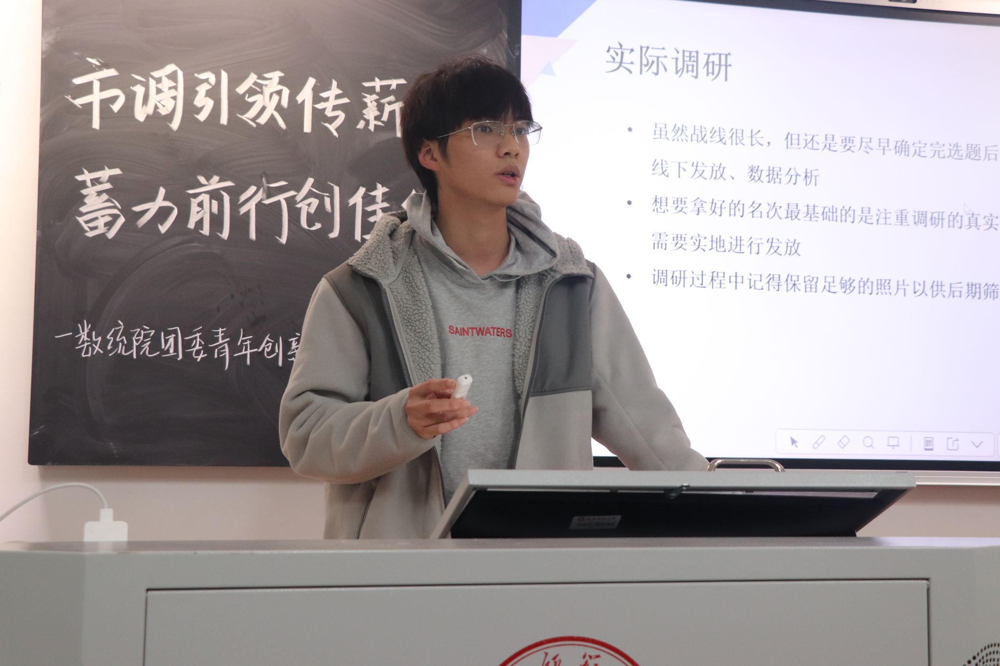 (通讯员 刘广斌 杨依帆)为增进同学们对全国大学生市场调查与分析大赛的了解,11月30日晚,数学与统计学院(以下简称“数统院”)团委青年创新创业指导中心于桃花坪校区实训楼202教室开展“市调引领传薪火,蓄力前行创佳绩”精勤讲堂。数统院团委指导老师肖惠卿指导此次活动,2022级数一班刘潇漫、大数据班姜翔担任主讲人。