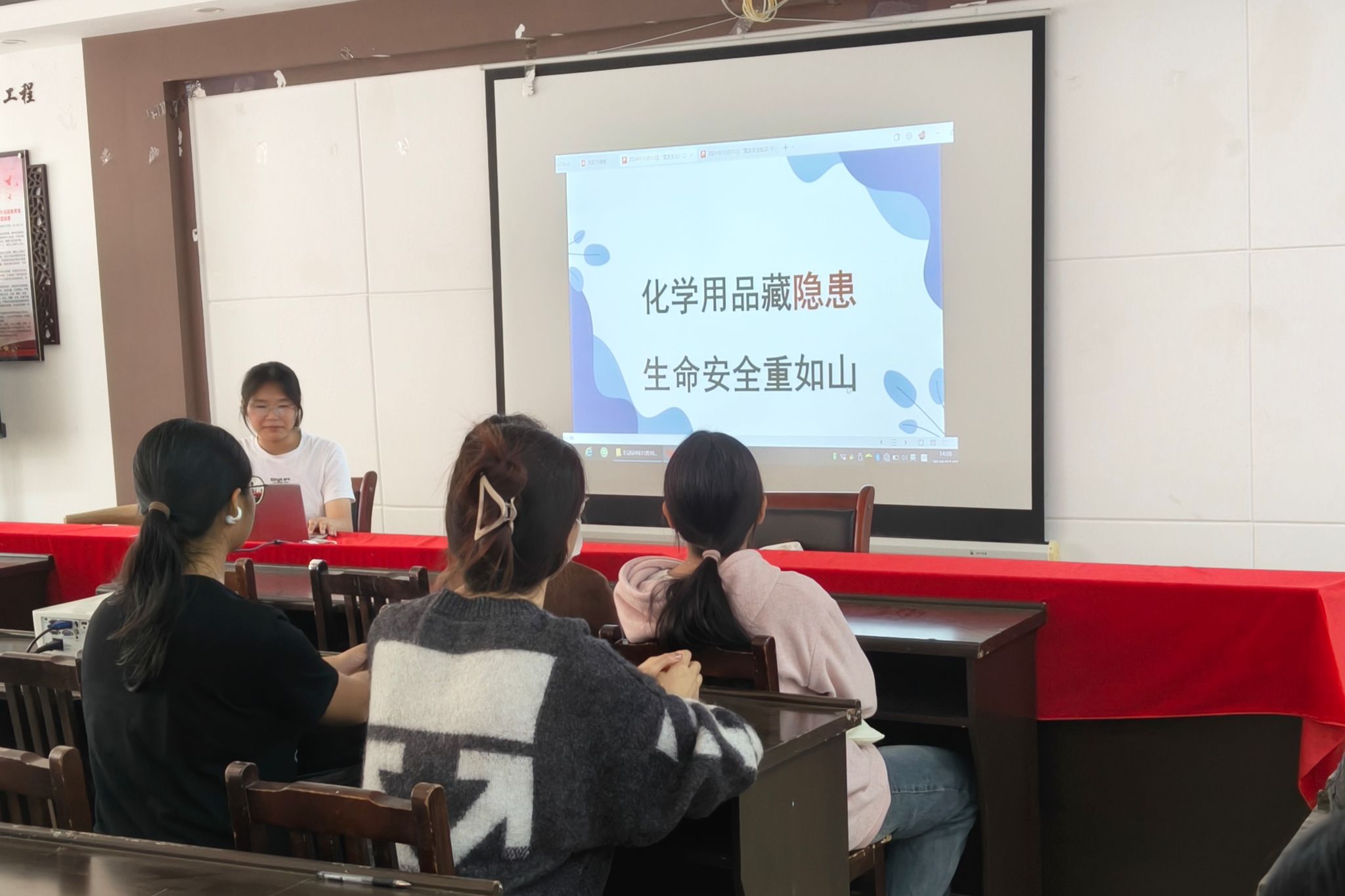 图为化工院在溁湾镇社区开展“化学用品藏隐患,社区安全重如山”志愿活动,志愿者通过PPT向居民讲授生活中常见的隐患。