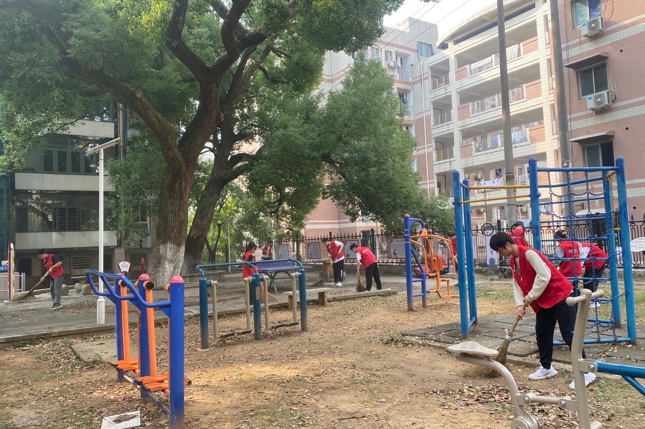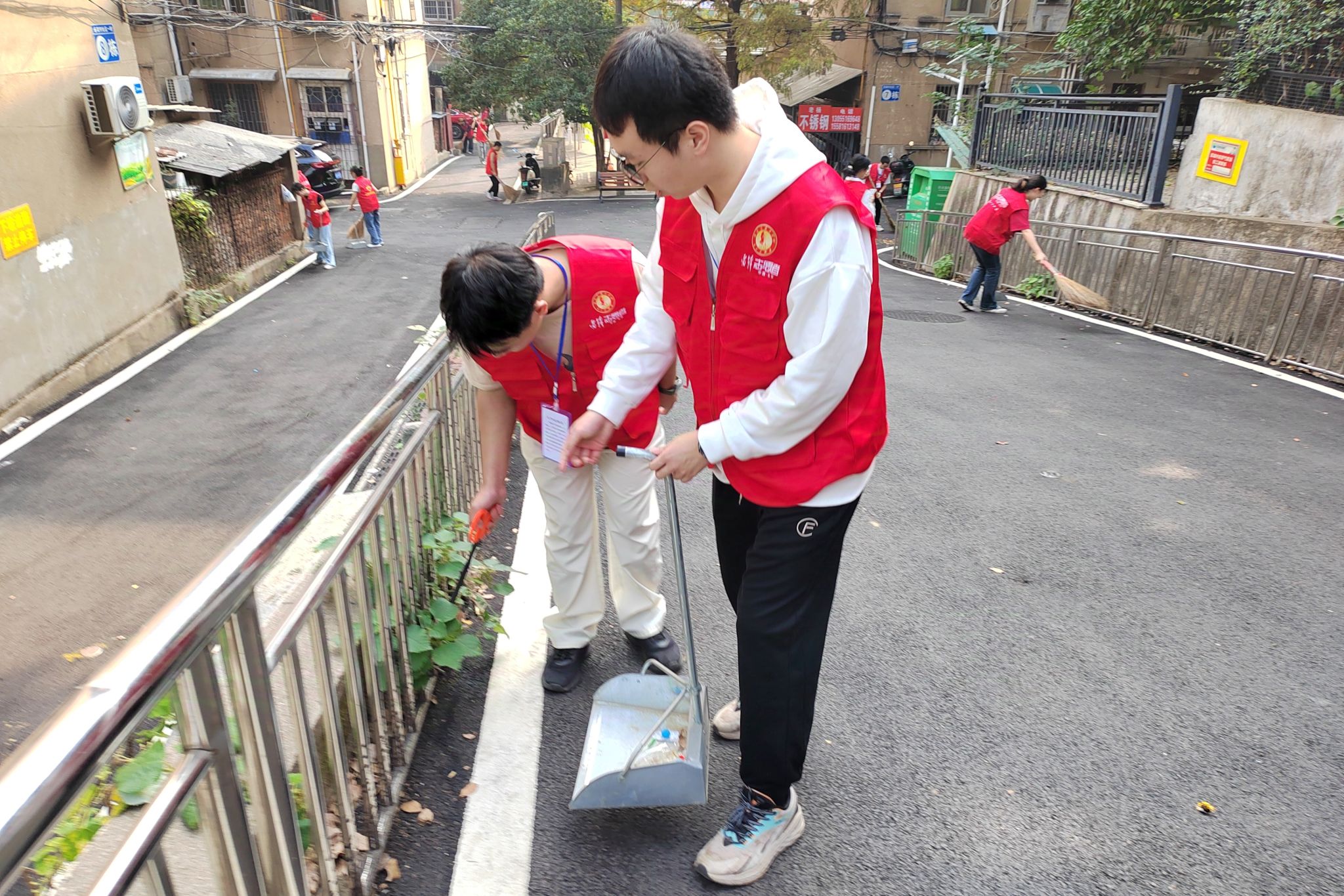 图为化工院2301班在橘子洲街道岳南村社区开展“清洁行动,一路生‘化’”志愿活动,志愿者打扫社区街道。