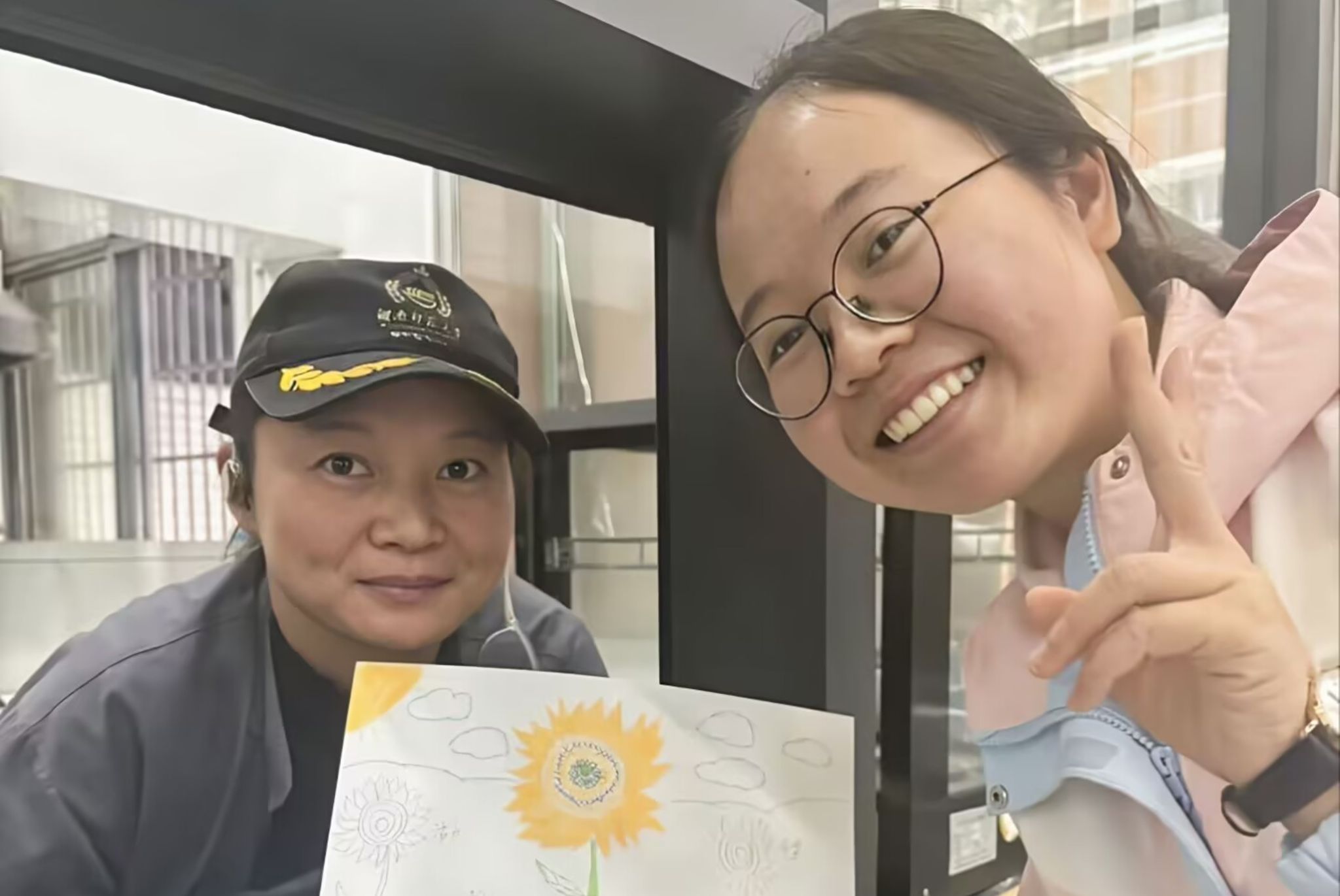 图为化工院2403班志愿者将画和贺卡送给食堂阿姨。