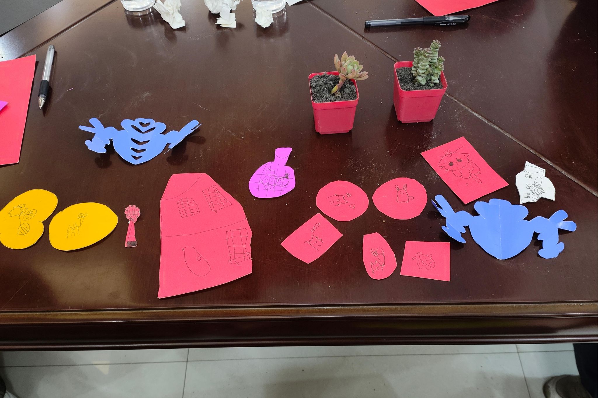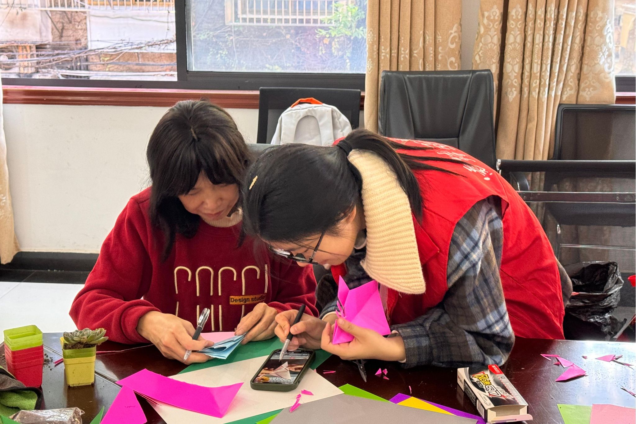 图为参与者在志愿者的指导下制作的剪纸作品。