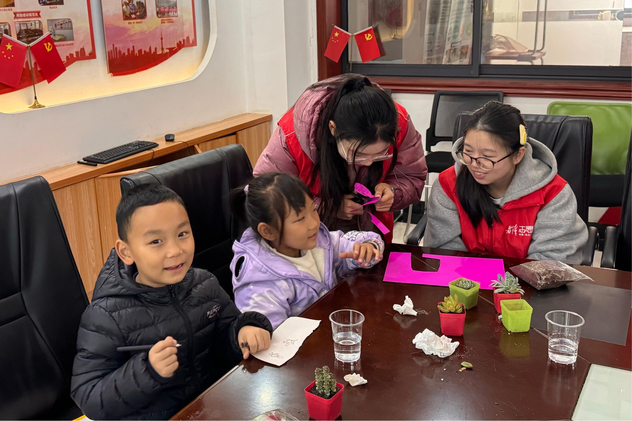 图为志愿者指导小朋友制作剪纸作品,小朋友们认真学习技巧。