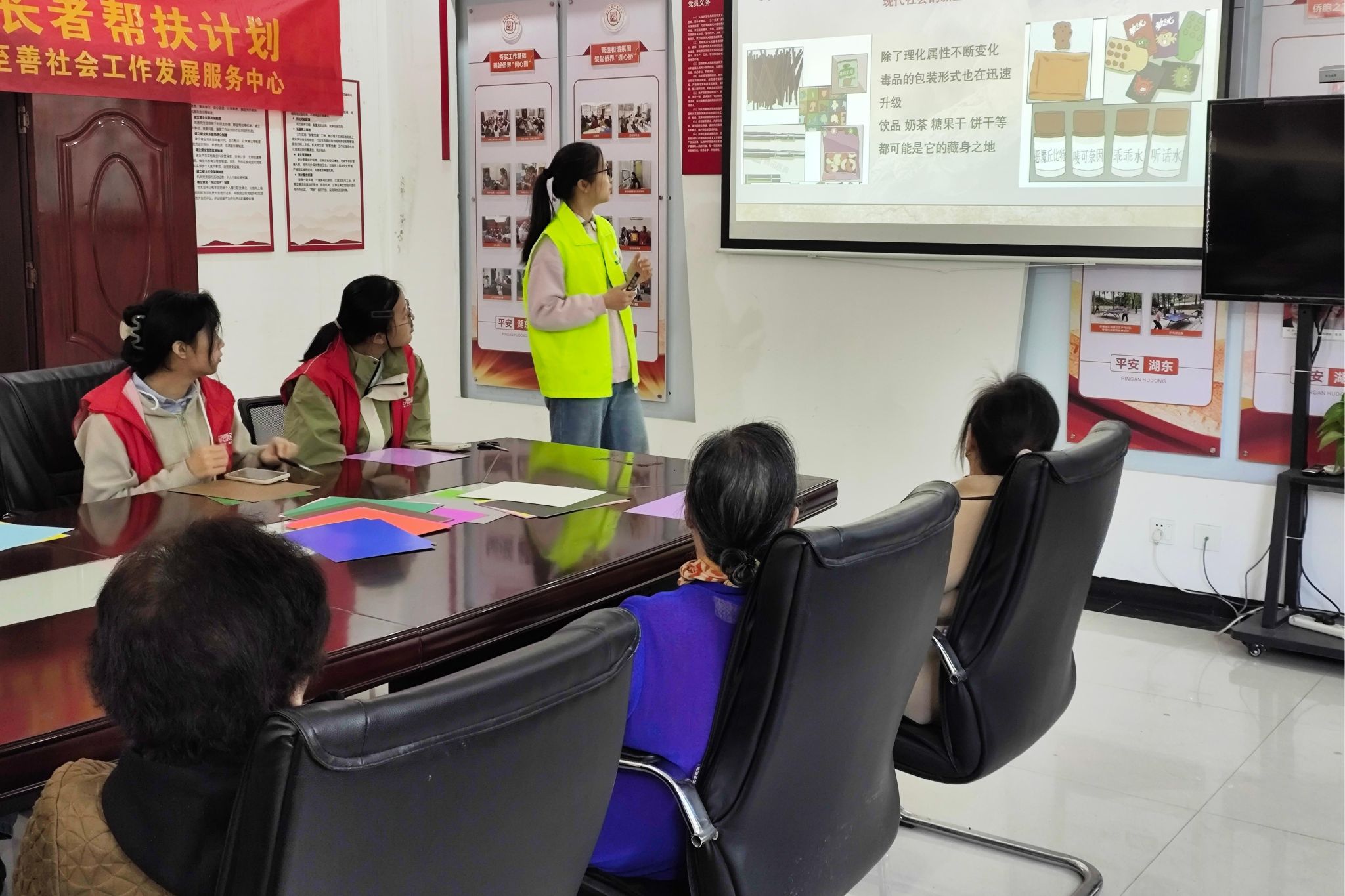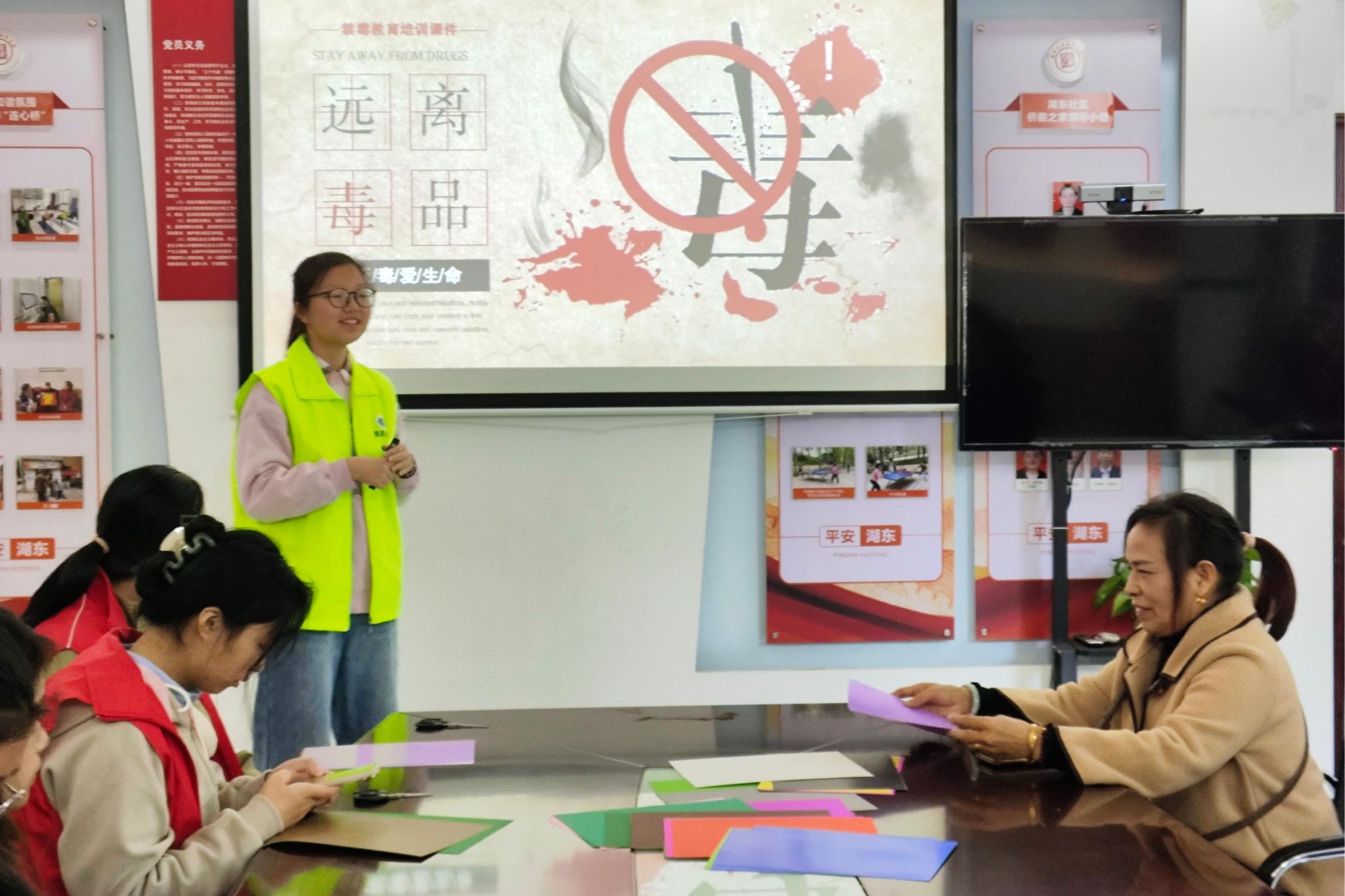 活动伊始,志愿者们围绕毒品的定义、具体危害、群众易受骗的原因以及有效的预防吸毒方法,进行了深入宣讲。他们采用层层剖析的方式,结合真实案例与科学解析,使在场的参与者对毒品的危害及防毒策略有了更为全面的认识。宣讲环节结束后,为了及时解决参与者的疑惑,活动设置了互动问答环节。在这一环节中,参与者纷纷举手提问,志愿者们则从不同角度、多个层面为参与者答疑解惑。此外,活动还融入了剪纸制作环节。在志愿者的指导下,参与者们制作剪纸作品,并在作品上绘制图案,写下自己对防毒事业的期望与祝福。