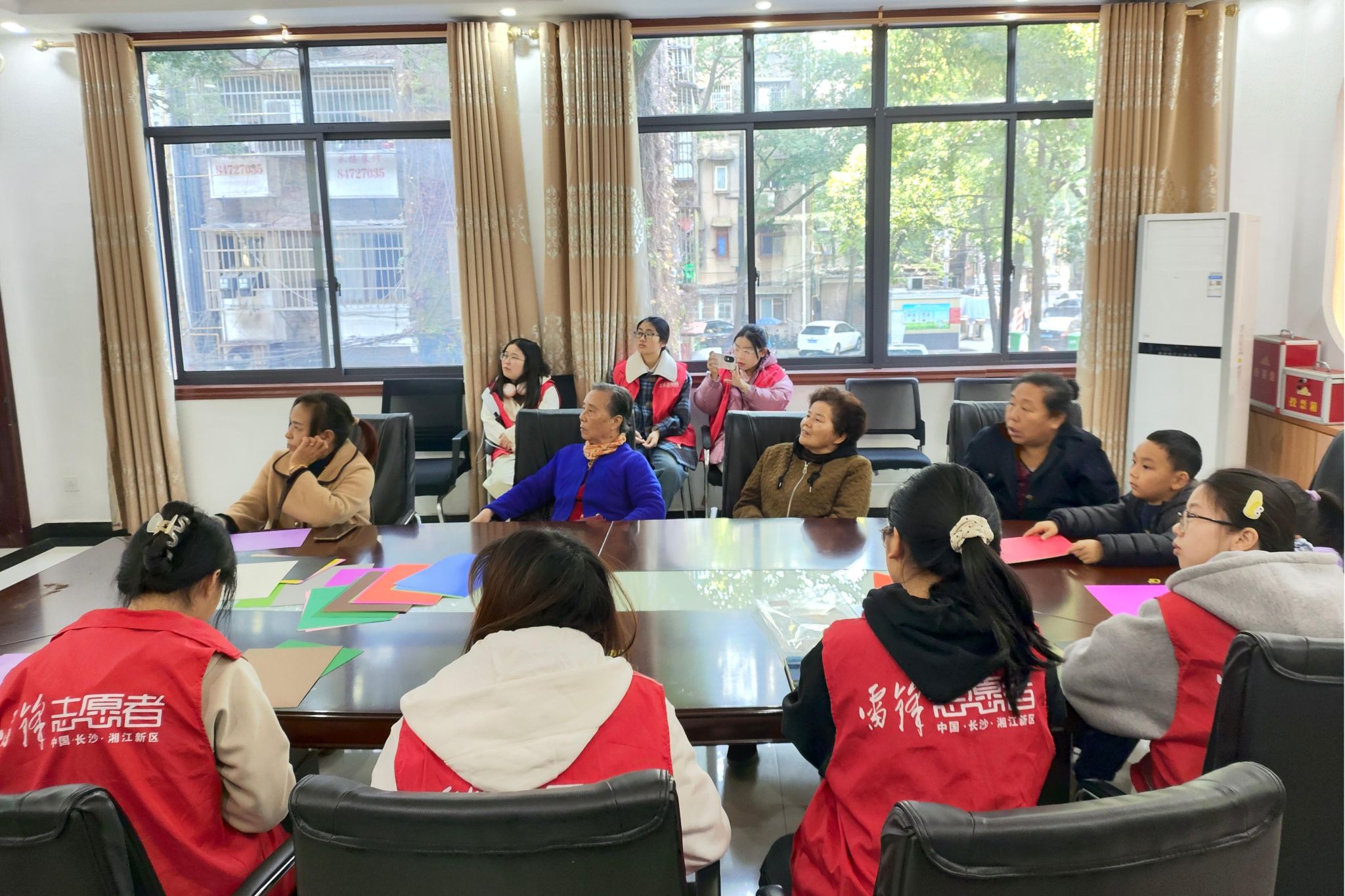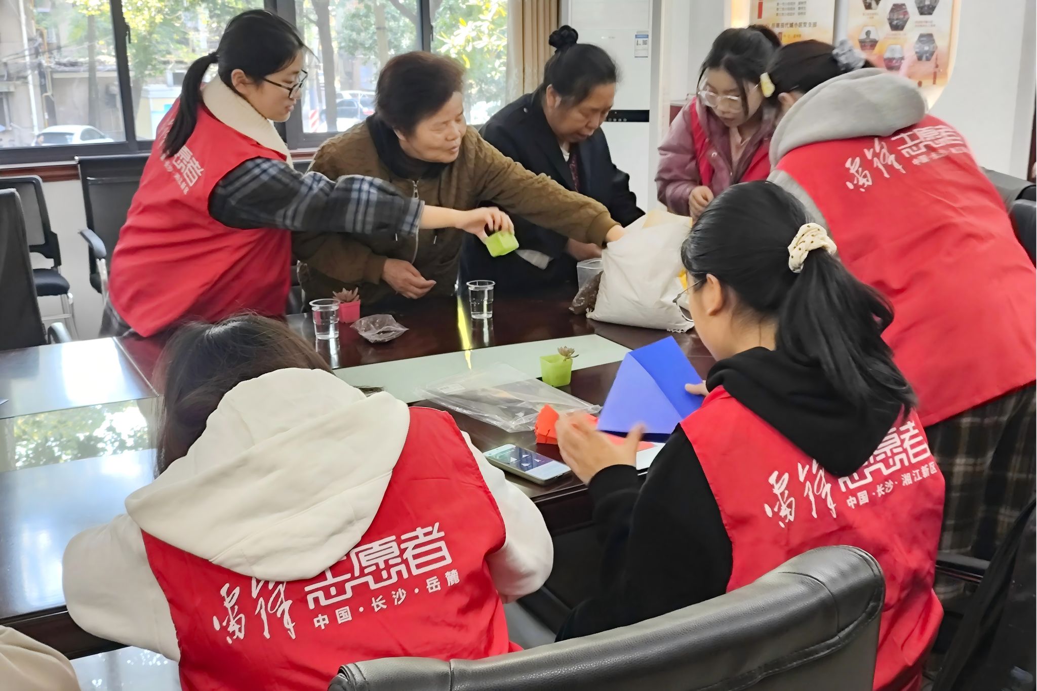 图为制作手工艺品前志愿者向参与者分发剪纸材料。