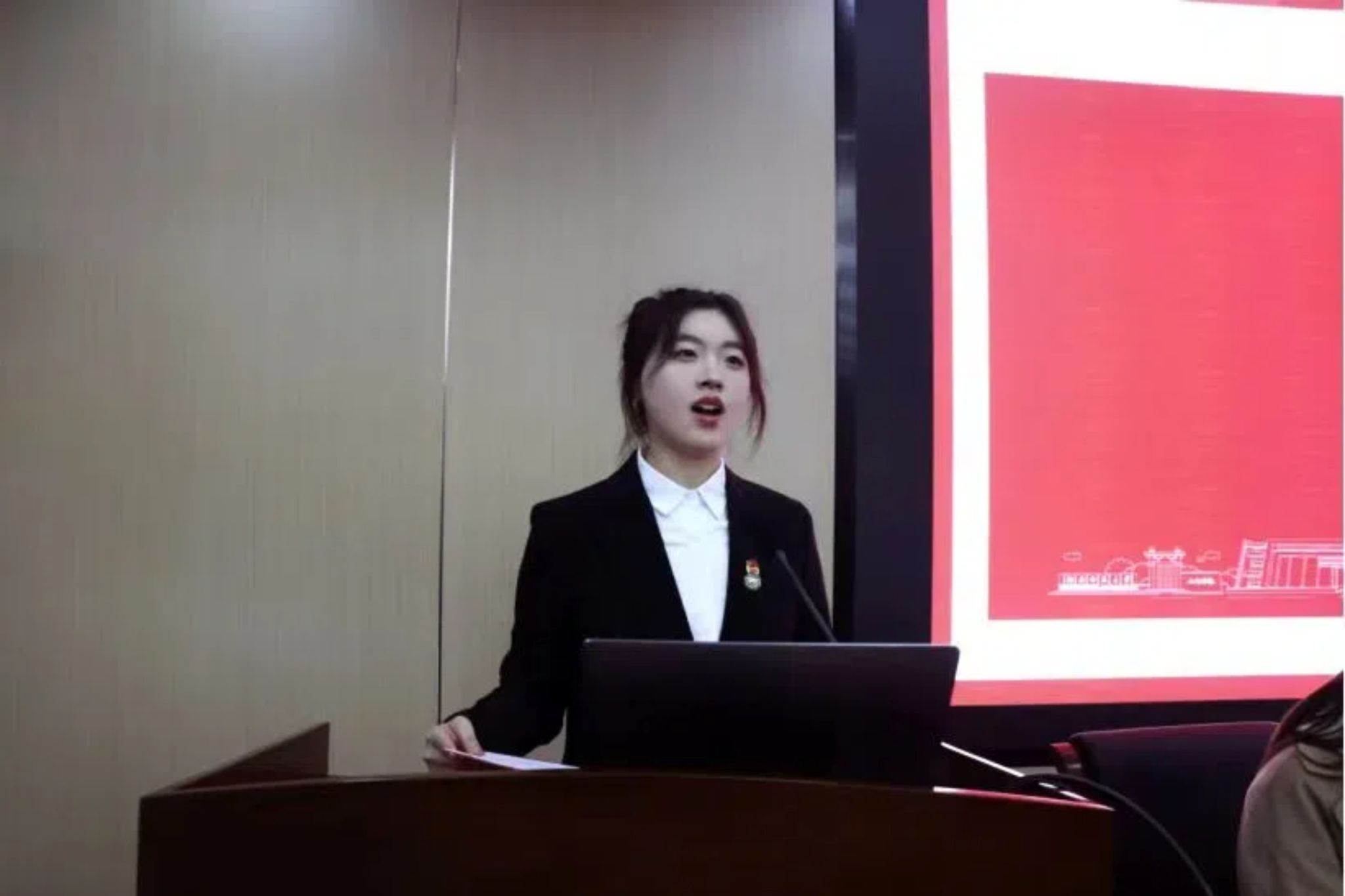 “红旗团支部”获奖代表与“十佳学生干部”获奖代表先后进行发言。“红旗团支部”获奖代表从学风建设、社会实践与文体活动三个方面讲述班级的班团建设,树立了一个班级团支部建设的榜样;“十佳学生干部”获奖代表阐述了作为一名共青团干部的重大责任与使命,她代表文院的共青团干部们作出承诺:他们将继续发扬“仁爱精勤”的精神,不仅在学业上追求卓越,更要在社会实践、志愿服务、创新创业中不断突破自我。