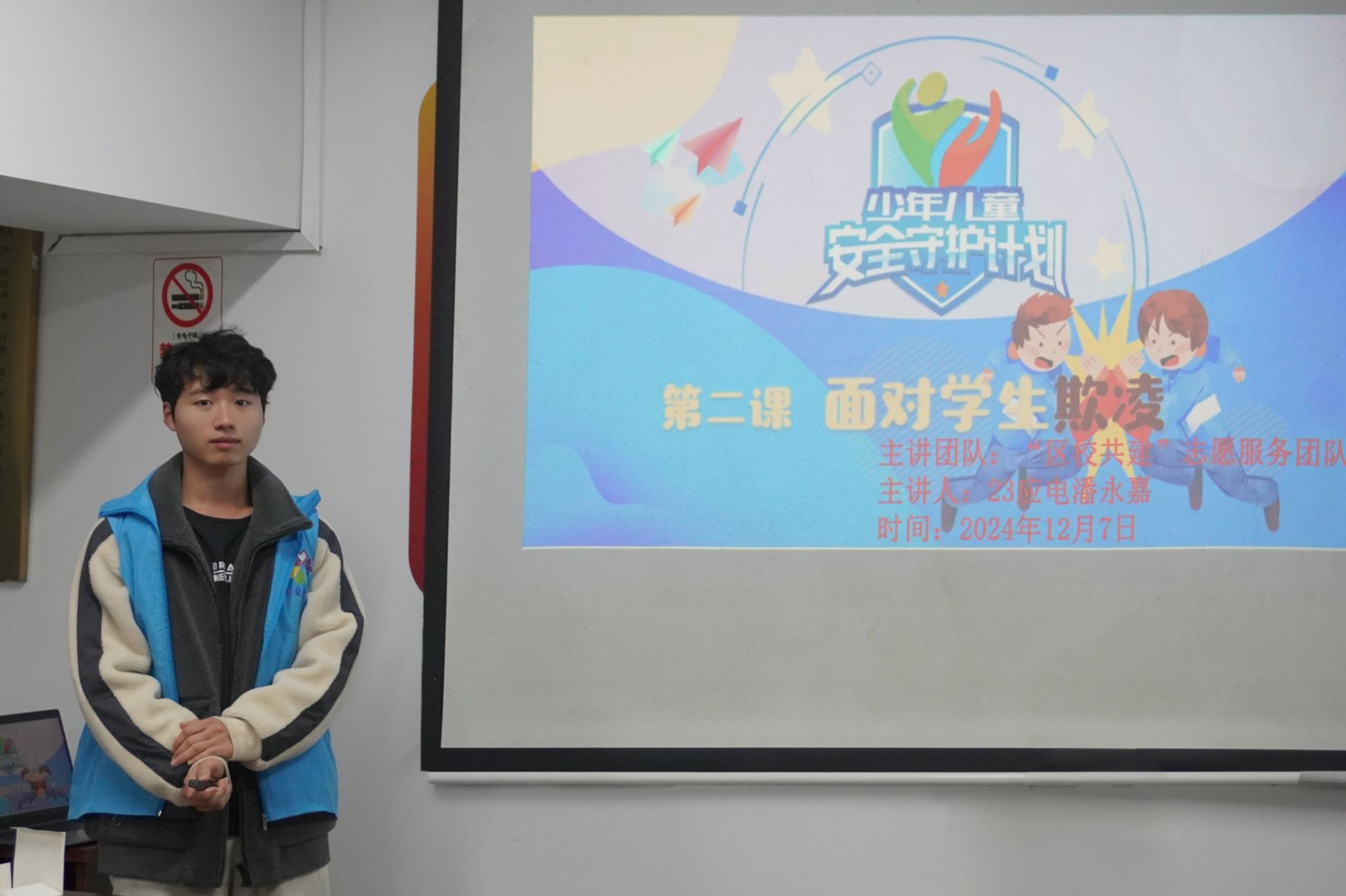 (通讯员 李玲珍 何嘉琬)为加深儿童对学生欺凌现象的认知,增强儿童的自我保护意识,12月7日上午,工程与设计学院团委区校共建志愿服务团队于工设院中栋406教室开展主题为“安全守护•面对学生欺凌”的趣味课程。2023级应用电子技术教育专业潘永嘉担任课堂主讲人。工设院共6名志愿者参加此次活动。