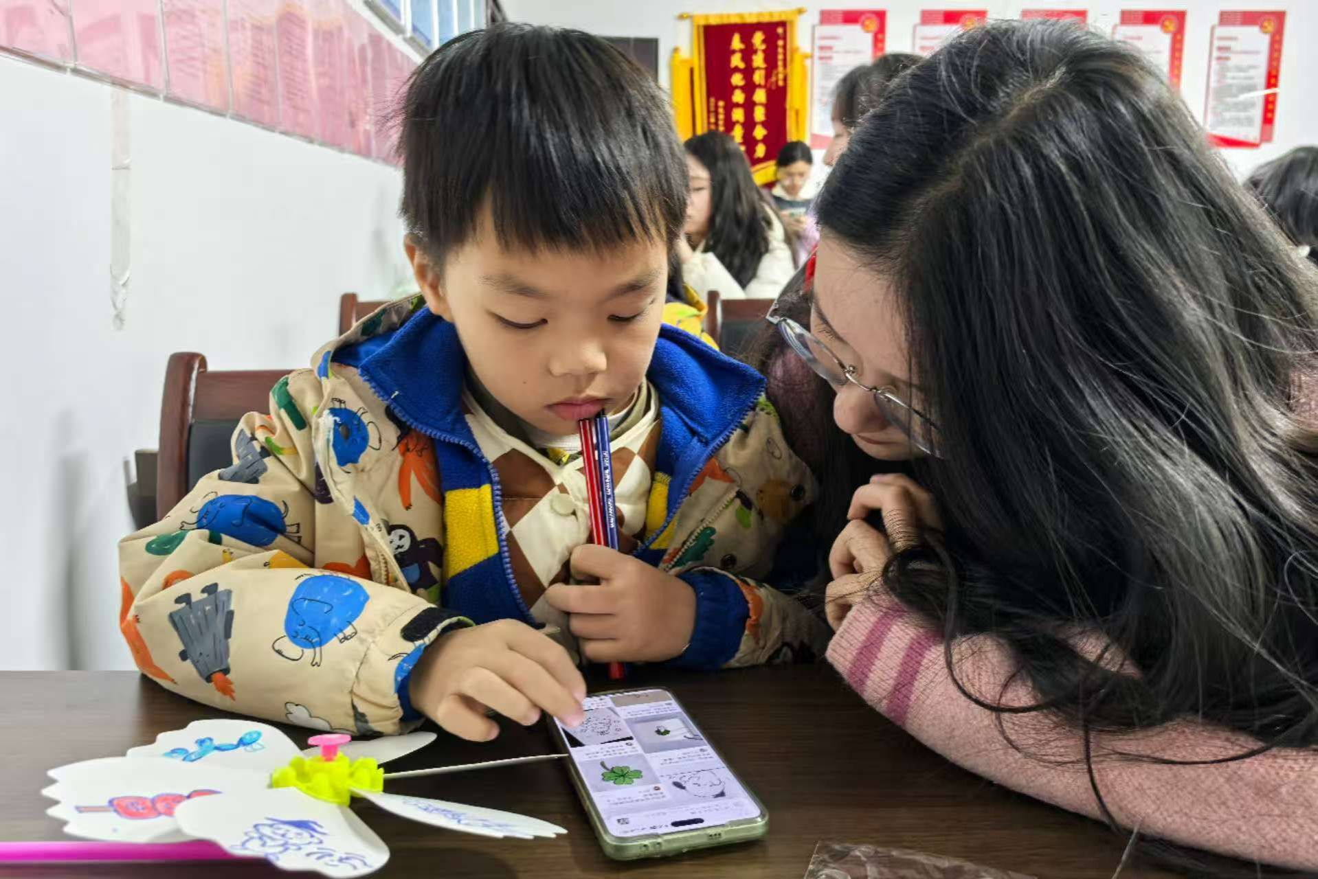 志愿者和小朋友共同设计风车