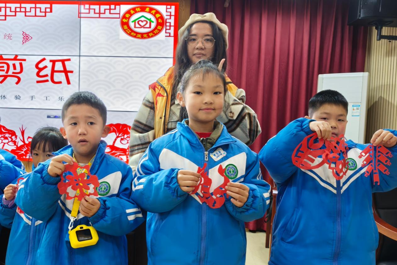 活动中,主讲人通过PPT展示和互动问答,向小朋友们介绍了窗花剪纸的历史渊源、文化内涵及不同地域的剪纸风格。她展示了精美的窗花剪纸作品,并结合实际案例,讲解了窗花剪纸在传统文化中的重要地位。随后,主讲人演示了折纸、剪纸的基本技巧,从纸张折叠到图案裁剪,逐步引导小朋友们掌握制作方法。志愿者们分组协助,指导小朋友们完成每一步操作,课堂氛围轻松活跃。小朋友们充分发挥想象力,剪出了形态各异的窗花剪纸作品。