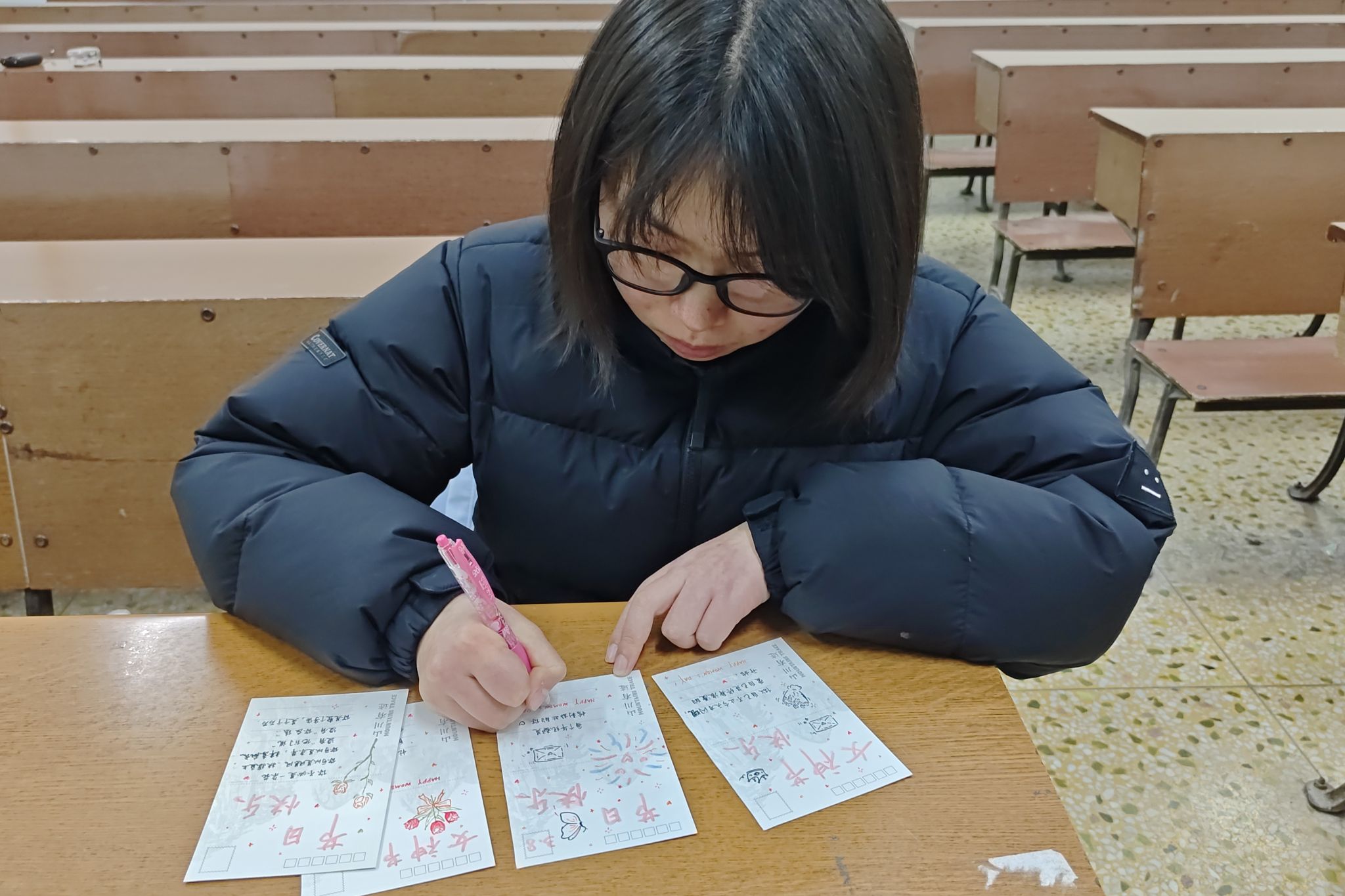 子项目“‘锋’情致敬,巾帼有爱”将“关爱他人”的雷锋精神与妇女节主题结合,倡导学生通过日常小事传递善意。在活动中,志愿者们制作了贺卡等礼物,并赠送给身边的女性长辈及同学,向她们表达关心与祝福。在“爱心义工,不负‘食’光”活动环节中,志愿者们分组开展餐桌清洁、地面清扫等工作,不仅了解了食堂工作人员的日常工作,还增强了节约粮食的意识。此外,“践雷锋志,传敬老情”子活动也同步进行,志愿者们在负责人的带领下,前往轻松关爱老年公寓与老人聊天谈心,排解他们心中的孤独感,并向他们宣传生活安全常识。