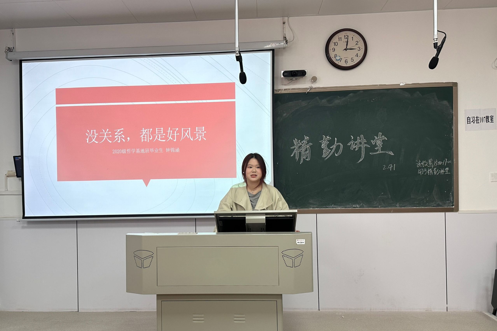 (通讯员 文丽斯 魏晴 谭欣雨)为提高同学们的自主意识,拓宽认知视野,把握未来方向,3月16日下午,公共管理学院(以下简称“公管院”)于景德楼中栋113教室举办了以“没关系,都是好风景”为主题的精勤讲堂。此次精勤讲堂邀请了2020级哲学基地班同学钟锦涵(现为潇湘晨报记者,曾任太阳成集团tyc校辩论队成员)担任主讲人,2024级政治学与行政学专业施慧桥担任主持人,公管院2022级、2023级、2024级共68名同学参加此次精勤讲堂。
