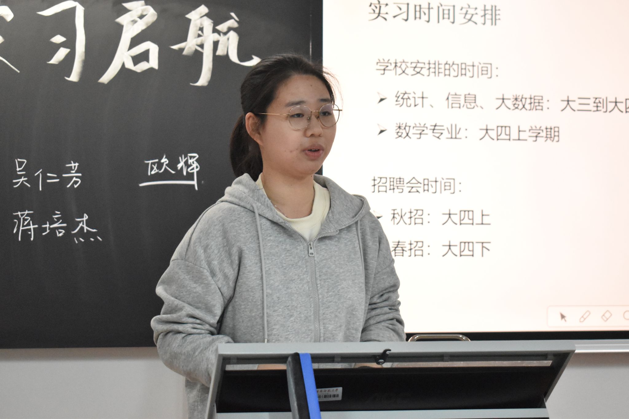 (通讯员 陶薇羽 周楚晴)3月21日晚,数学与统计学院(以下简称“数统院”)团委青年创新创业指导中心于桃花坪校区实训楼202教室开展“实习启航,筑梦数统”精勤讲堂。数统院2021级大数据班张逸化、项悦悦担任主讲人,数统院2023级、2024级部分学生参与此次活动。