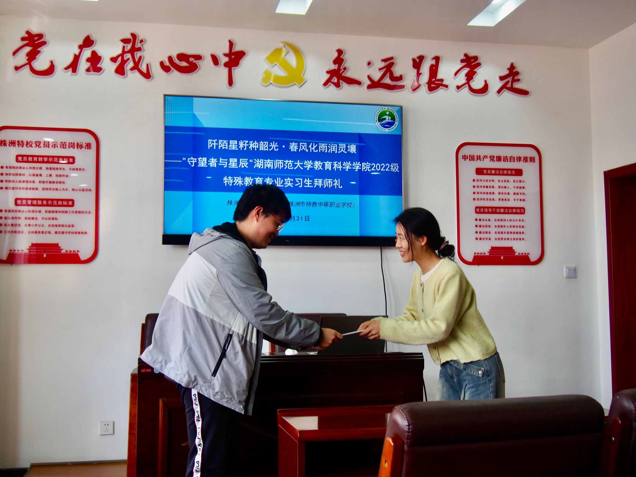 (通讯员 黎启业 吴怡静 蒙曦)为巩固实习队成员与带教教师“师徒结对”关系,进一步促进相互沟通交流。3月21日,教育科学学院赴株洲市特殊教育学校实习队于株洲市特殊教育学校党建活动室开展拜师仪式。株洲市特殊教育学校启智部主任易鸣、义务教育阶段全体启智部带教班主任,及启智部实习队员参与活动。