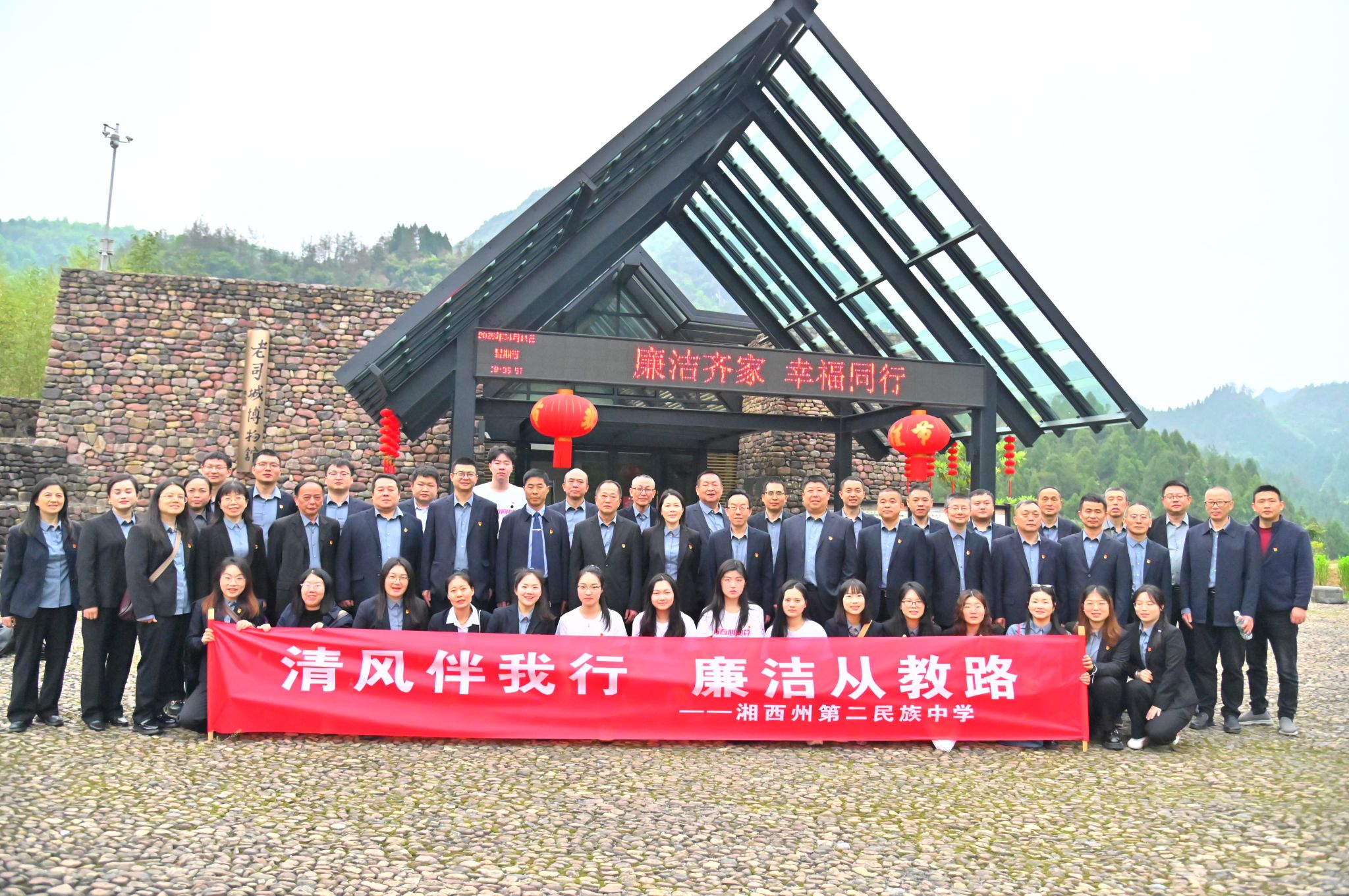 上午9时,支教团成员随校方代表深入老司城博物馆,在讲解员引导下系统了解土司制度沿革与民族文化精髓。在廉洁文化示范基地,800年土司王朝"忠勤体国、清廉守正"的执政智慧令队员们深受触动。通过《德政碑》"甘棠遗爱"碑文解读、廉政文物观摩及土家族传统廉政故事讲解,青年教师们深切体会到"为政以德"的深刻内涵。在廉政文化展厅,结合全面从严治党典型案例与警示教育影片,队员们系统学习了新时代廉洁文化建设要求。