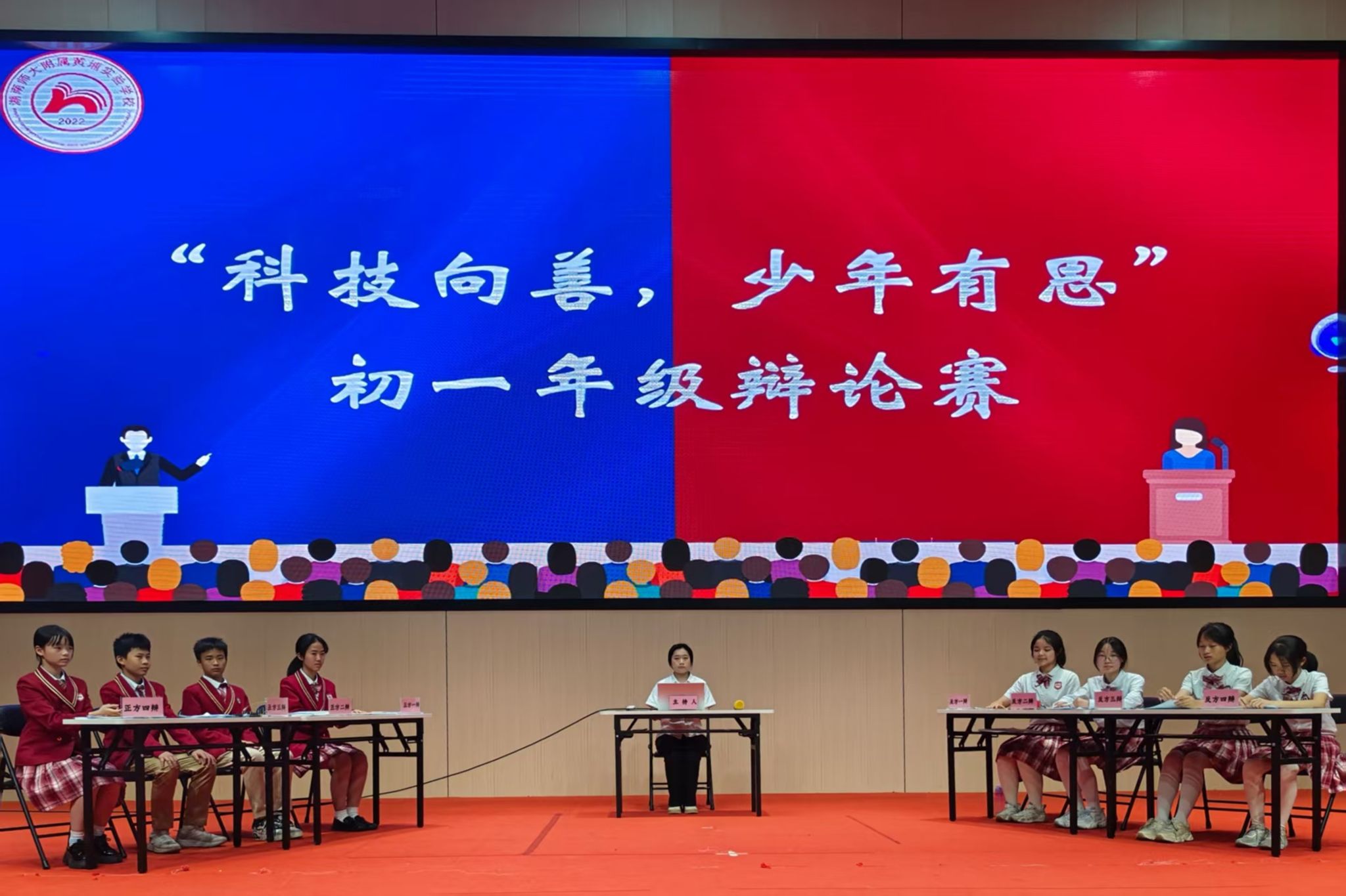 (通讯员 鲁杨钰 吴盈盈 李萱)4月15日晚,由文学院2022级赴湖师黄埔实习队承办的“科技向善·少年有思”辩论赛决赛在太阳成集团tyc附属黄埔实验学校架空层集会场开展。此次辩论赛由实习队队长李萱主持,8名七年级学生辩手参加,校长杜军、专职副书记李泰锋、教务处主任颜方勇、七年级总管周琪明、校语文教研组组长骆海贞和七年级语文教研组组长秦鑫担任评委,其余学生及实习队成员观赛。