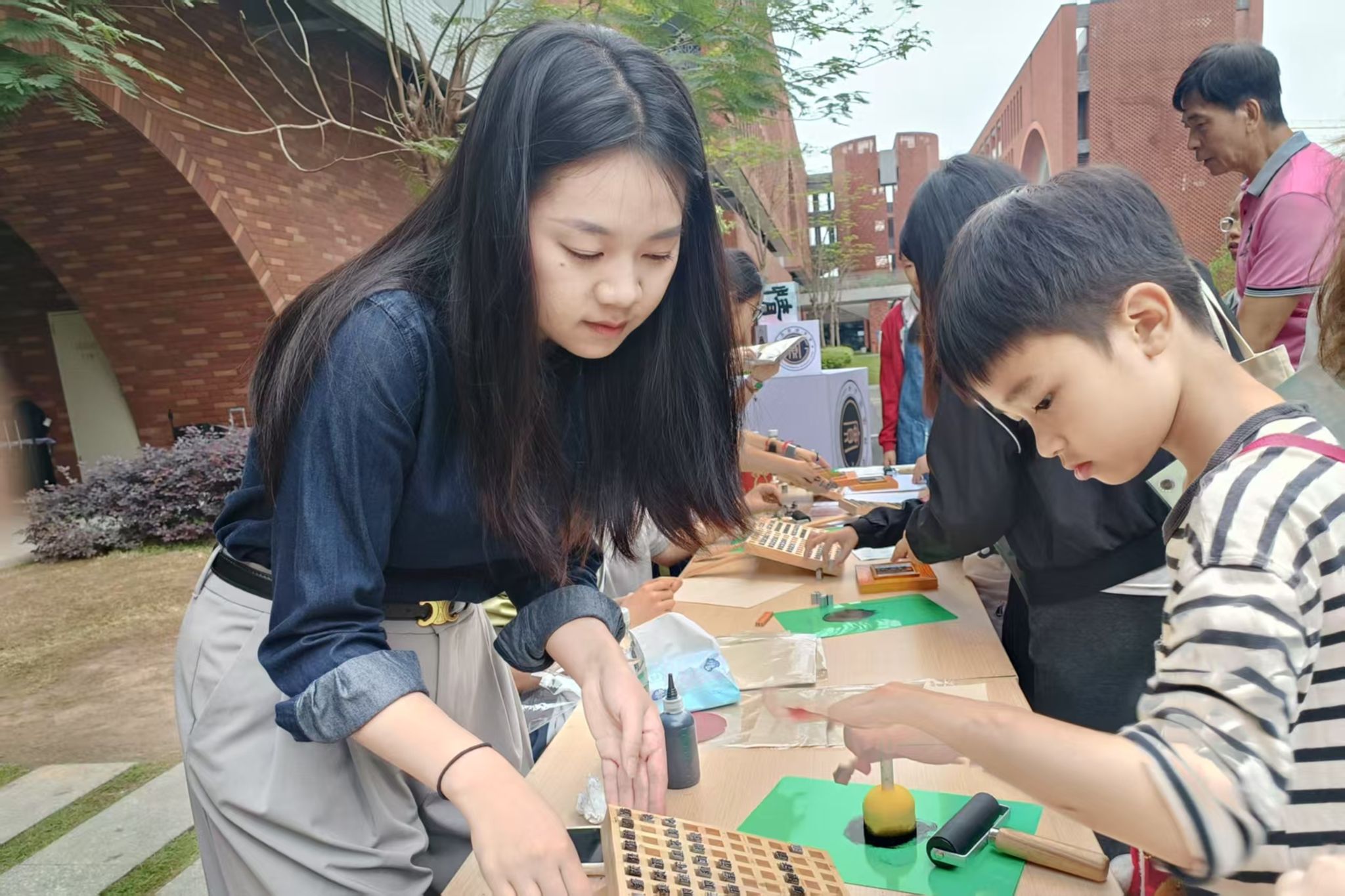 活动以“甲骨文限时辨识”“活字印刷体验”“粤语朗诵”三大互动环节为核心。参观人员通过辨认甲骨文卡片集章兑换奖品,用活字印刷材料拓印古诗,现场学习粤语版诗词朗诵。活动现场,实习队员们分工明确、相互协作。部分队员负责规则讲解,耐心解答学生疑问。其余队员专注设备调试,确保互动环节流畅进行。活动通过集章制激发学生参与热情,现场气氛活跃。活动结束后,参观人员纷纷表示“在游戏中感受到了学校的文化与活力”。
