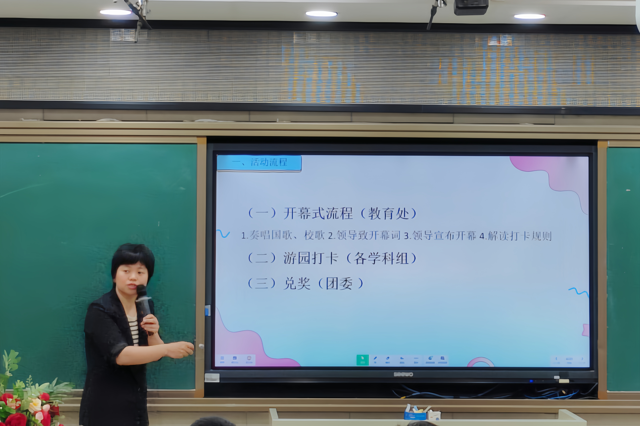 龙小华说明了此次校园嘉年华活动的重要意义,播放往届嘉年华活动科技板块的宣传视频,为此次活动的筹备提供了直观借鉴。为使参会人员明确活动流程和工作要求,她详细讲解了开幕式流程、游园打卡点位、项目规则和兑奖依据,并根据去年活动的经验,对重点事项进行细致说明。