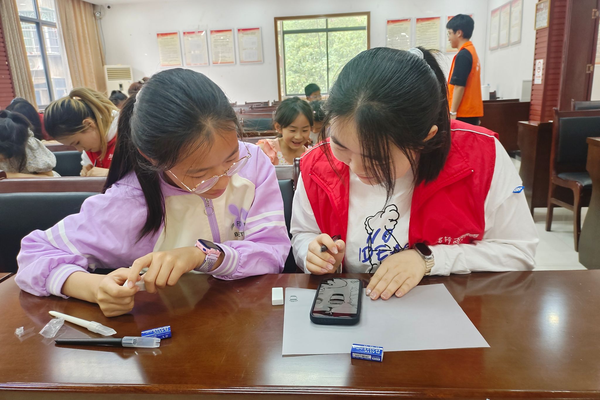图为志愿者与小朋友讨论新式设计,启发创新思考。