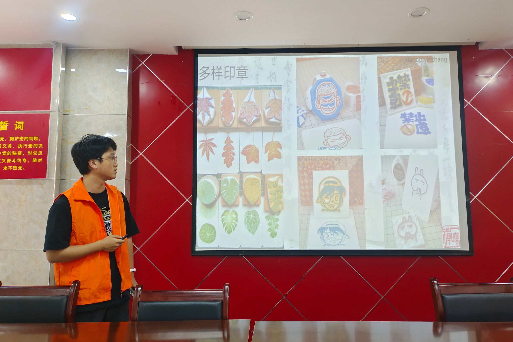 图为活动现场,主讲人向参与者讲解印章的图案种类。