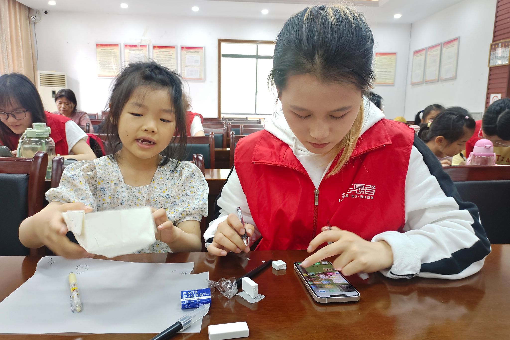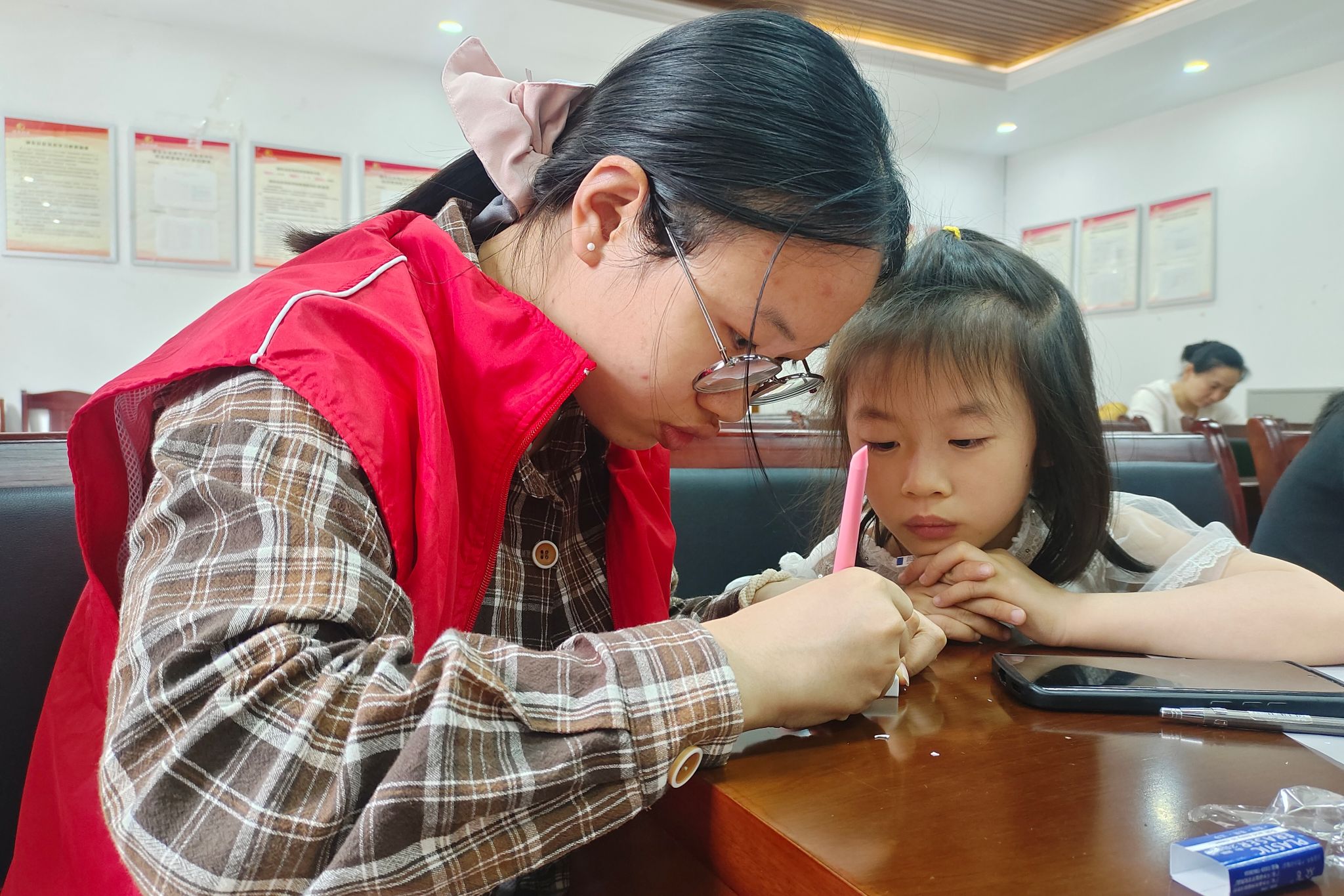 图为志愿者正在向小朋友演示篆刻刀法,共同创作作品。