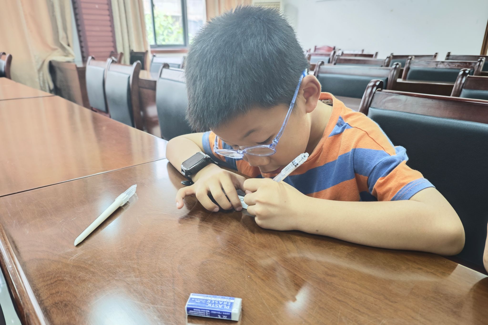 图为小朋友正在独立设计,构思橡皮印章的图案样式。