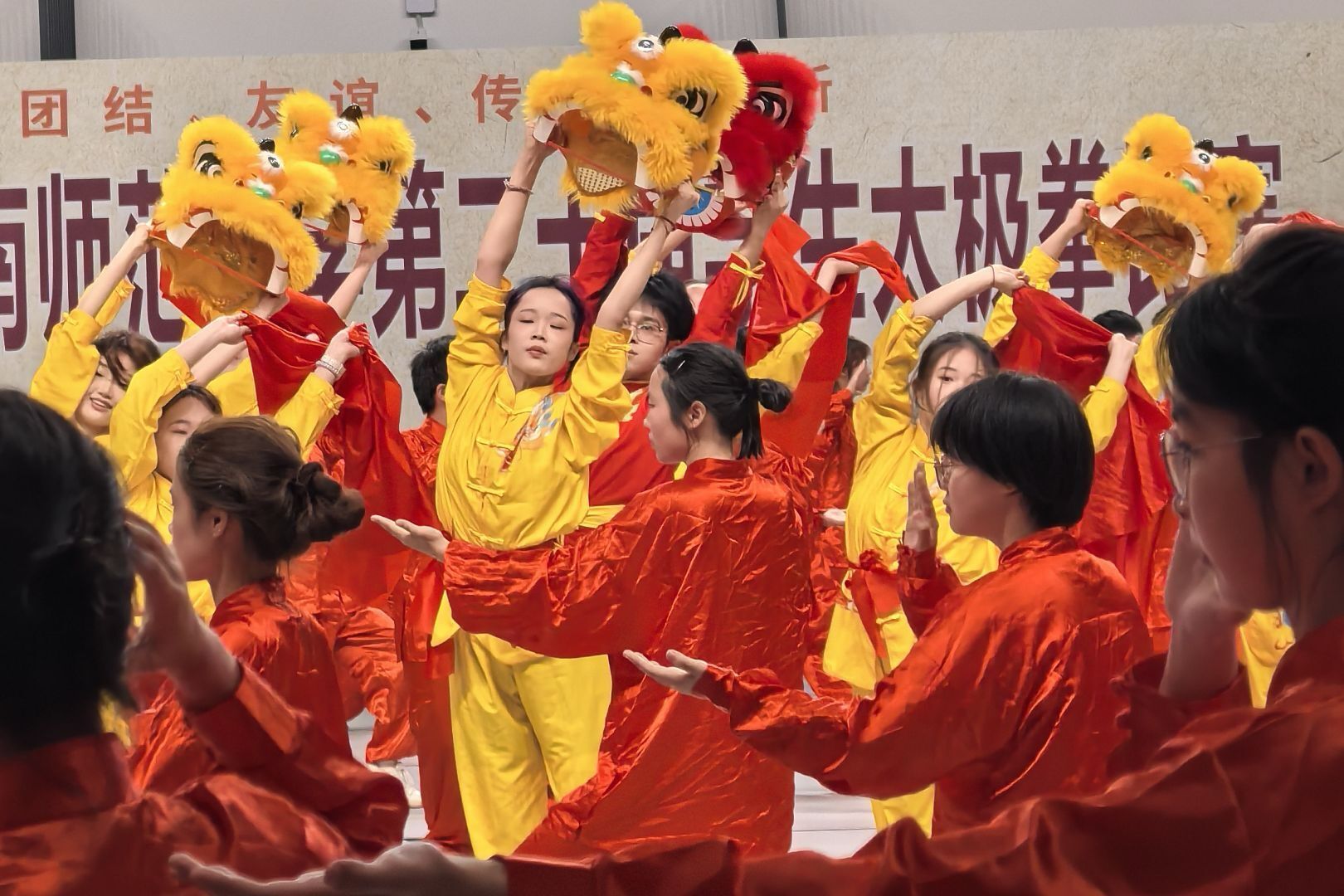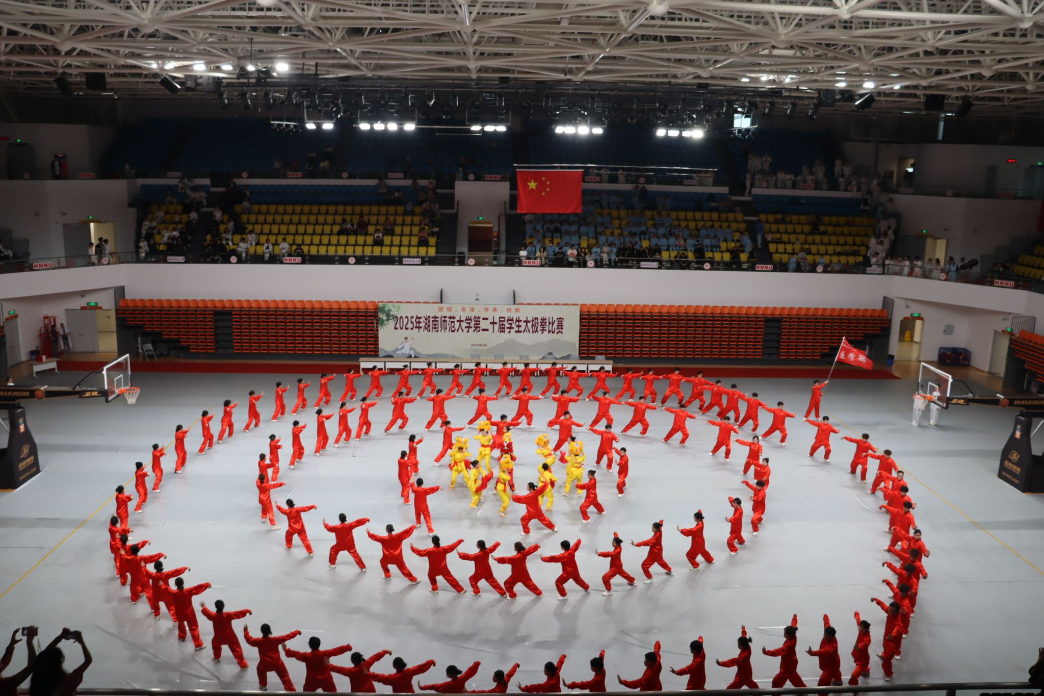 参赛同学由两侧入场,以“太极狮韵,医舞华章”为开幕式,伴随着悠扬的音乐,缓缓起势。“云手”动作柔中带刚、行云流水;“左右下势独立”整齐划一、开合有序,完成整套“二十四式简化太极拳”的展示后迅速变换队形,以响亮的口号“岳麓青青,湘水沧沧,医武相融,太极传扬”为表演收尾。