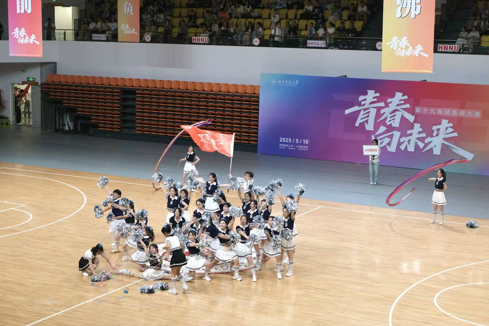 在决赛当天,代表队以整齐的着装、饱满的精神状态入场。在比赛过程中,队员们伴随着音乐的韵律,有序完成了跳跃、旋转、挥臂、托举等动作及队伍队形变换,在表演个人高难度技巧的同时通过集体相互配合发挥团队作用,生动诠释出《奔跑的青春》的主题,突出了健美操运动节奏鲜明、活力四射的特色。在此次决赛中,代表队获本科生组一等奖。比赛结束后,全体参赛队员和工作人员于体育馆内合影留念。