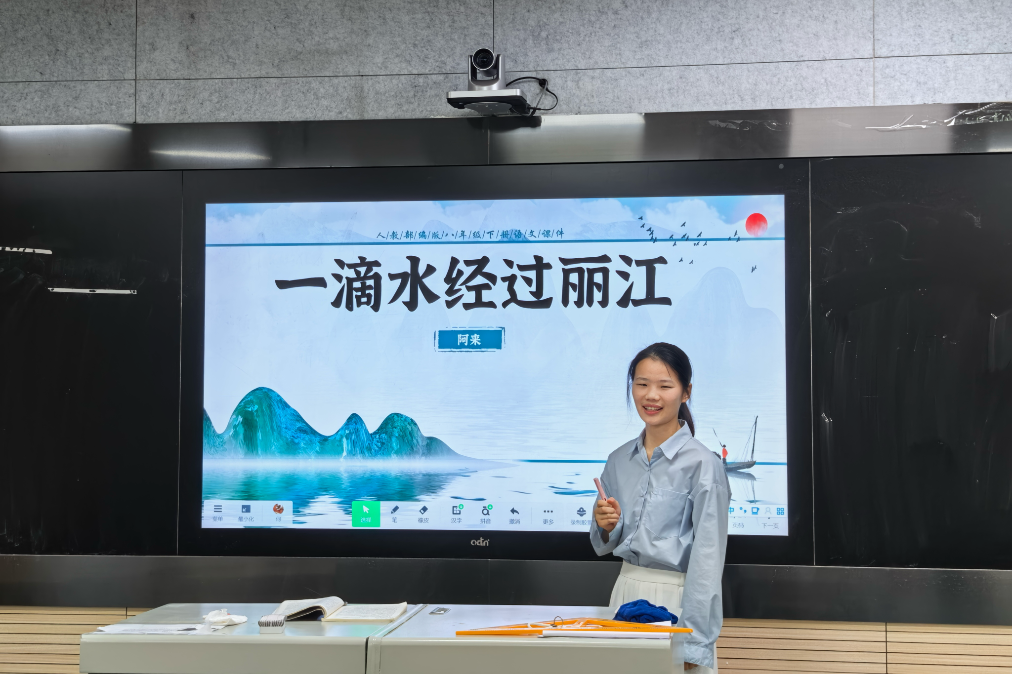 授课人在科技楼202录播室进行了《一滴水经过丽江》的公开课展示。她以导学案为学习支架,引导学生跟随“一滴水”的视角,梳理丽江的自然景观与人文风情,让学生领悟“人与自然和谐共生”的主旨。授课人还巧妙融入文创产品,通过引导学生设计盲盒,将语文课堂的文学性与趣味性充分融合。