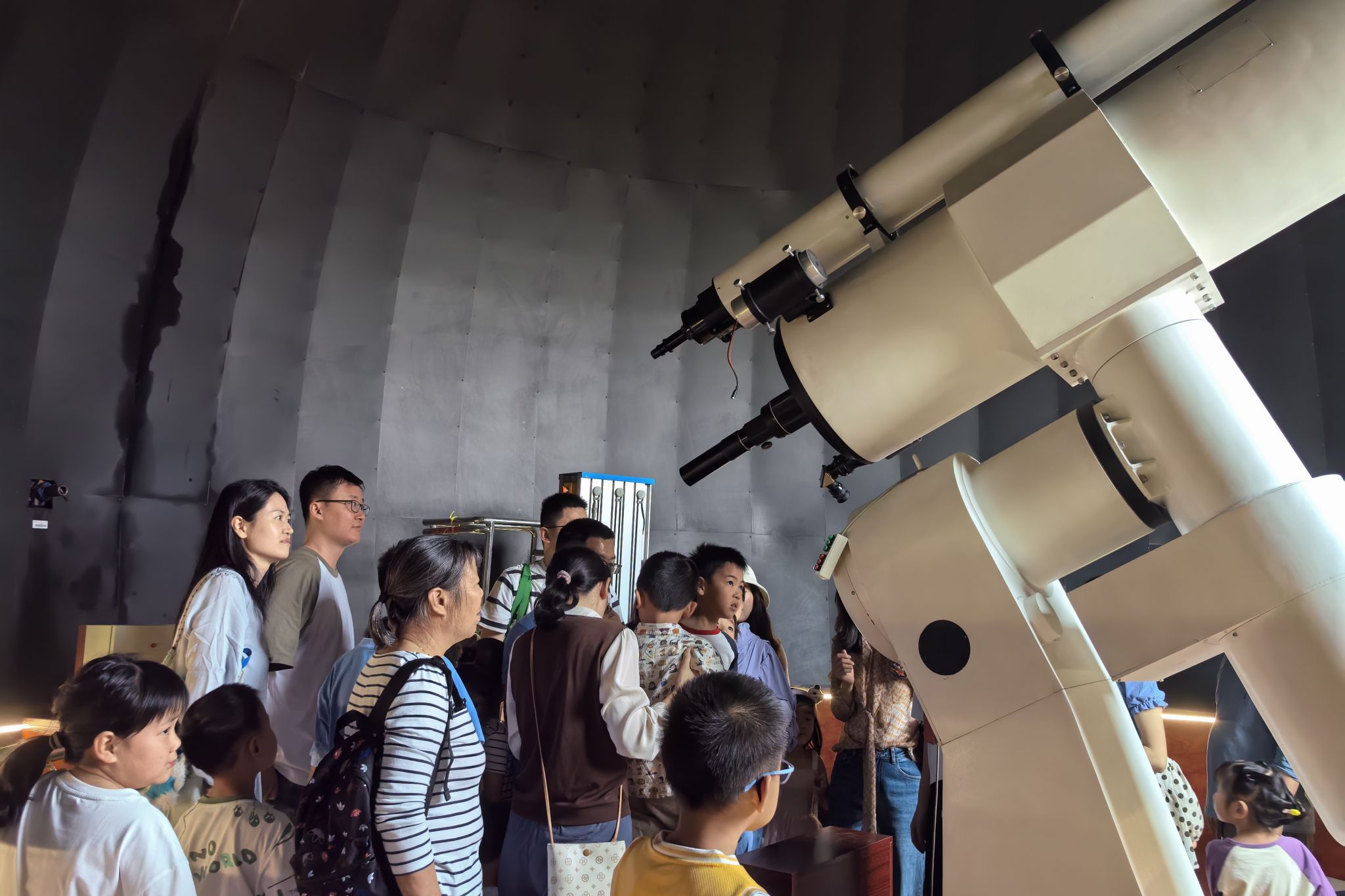 讲解员以图文结合的方式,阐述了二十四节气的由来以及中国古代流行的三种关于天地结构的学说。在谈到恒星的一生时,讲解员不仅带领小朋友们参观了馆内恒星模型,还引导他们入座并观看天文视频,进一步增加小朋友们对恒星的了解。此外,讲解员通过演示傅科摆设备,向小朋友们介绍了如何利用傅科摆证明地球的自转,并用通俗易懂的语言向小朋友们科普了热大爆炸宇宙学理论。此次活动将理论讲解与动手实践相结合。讲解员耐心指导小朋友们使用望远镜进行观测,并带领他们参观了顶层的折返式天文望远镜。