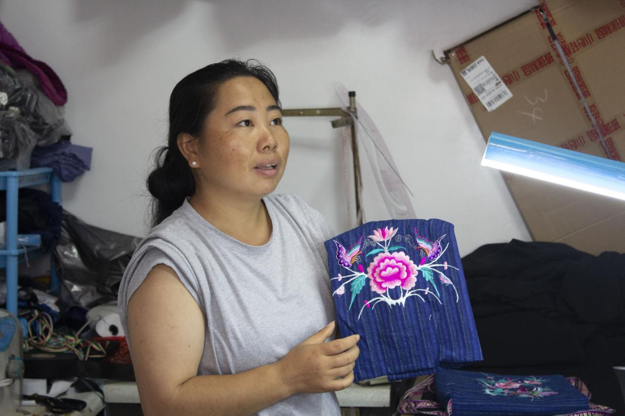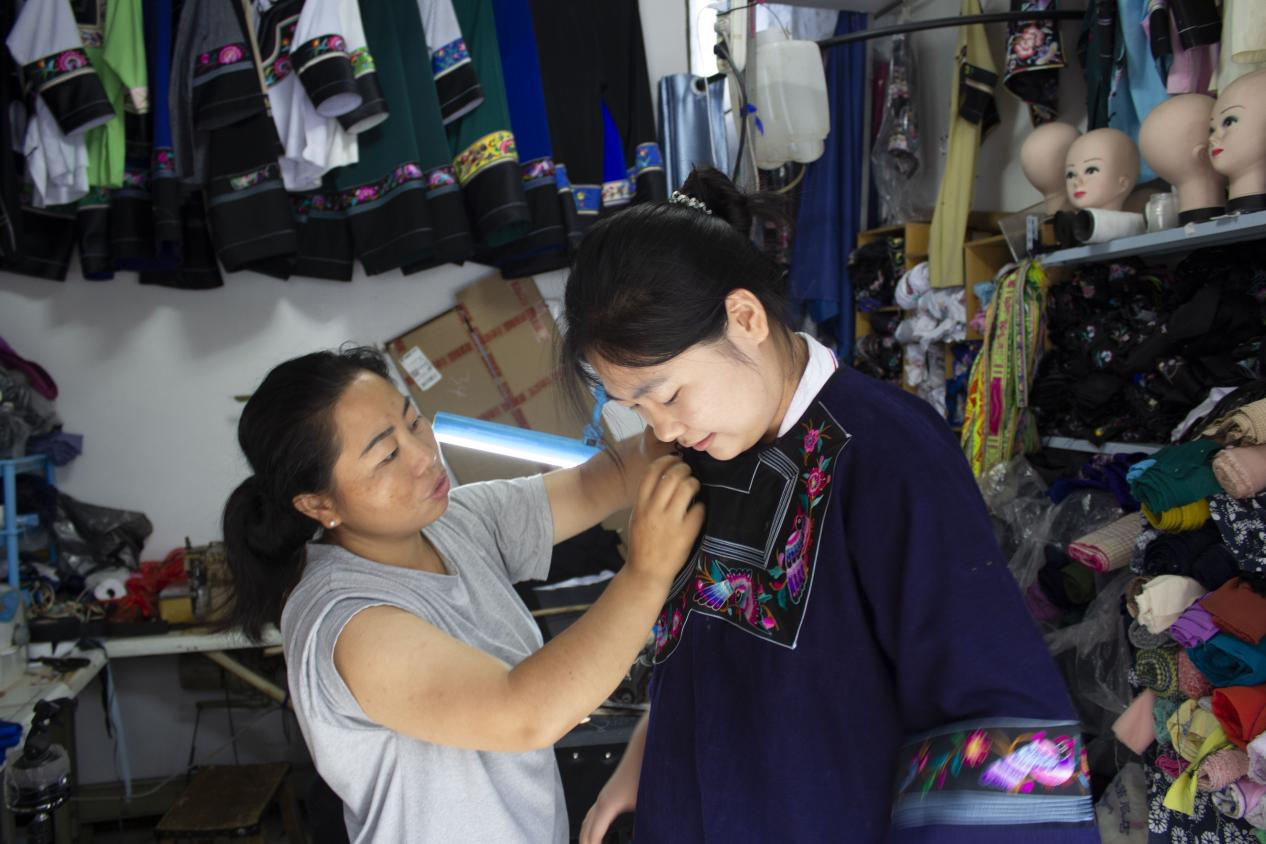 实践团成员来到国茶村集市,走进一家苗绣店铺对店主进行深入采访。店主详细介绍了苗绣的历史渊源、图案寓意和刺绣技法。苗绣作为苗族文化的重要载体,其纹样涵盖自然万物与神话传说,每一针每一线都蕴含着苗族人民对美好生活的向往与独特的审美观念。在店主的讲解下,成员们对苗绣的文化价值有了更深刻的认识。随后,实践团成员试穿苗族传统服饰,亲身体验苗绣工艺。在店主的指导下,成员们拿起绣针,尝试简单的刺绣针法,感受苗绣制作的精细与不易。通过实践,成员们不仅体会到苗绣工艺的独特魅力,也对非遗传承人的坚守与付出有了更深的敬意。