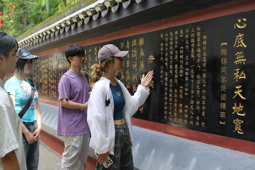 活动伊始,实践团队在工作人员的带领下走进纪念馆,该馆陈列了珍贵的文献资料和实物展品,生动再现了陶铸同志波澜壮阔的革命生涯和为党为民无私奉献的一生。参观过程中,讲解员讲述了陶铸同志在革命斗争中的种种故事,如“三不吃规定”“清廉拒礼”“故居让位水库”。参观完毕后,实践团成员相互交流了心得体会。“我们要继承老一辈无产阶级革命家的精神,以先辈为榜样,为党和人民的事业贡献力量。”队长总结道。实践团成员还结合新闻传播专业所长,精心拍摄制作了以陶铸精神为主题的红色小短片,通过镜头语言生动诠释革命先辈的风范,让红色故事在新时代青年中焕发新的生命力。