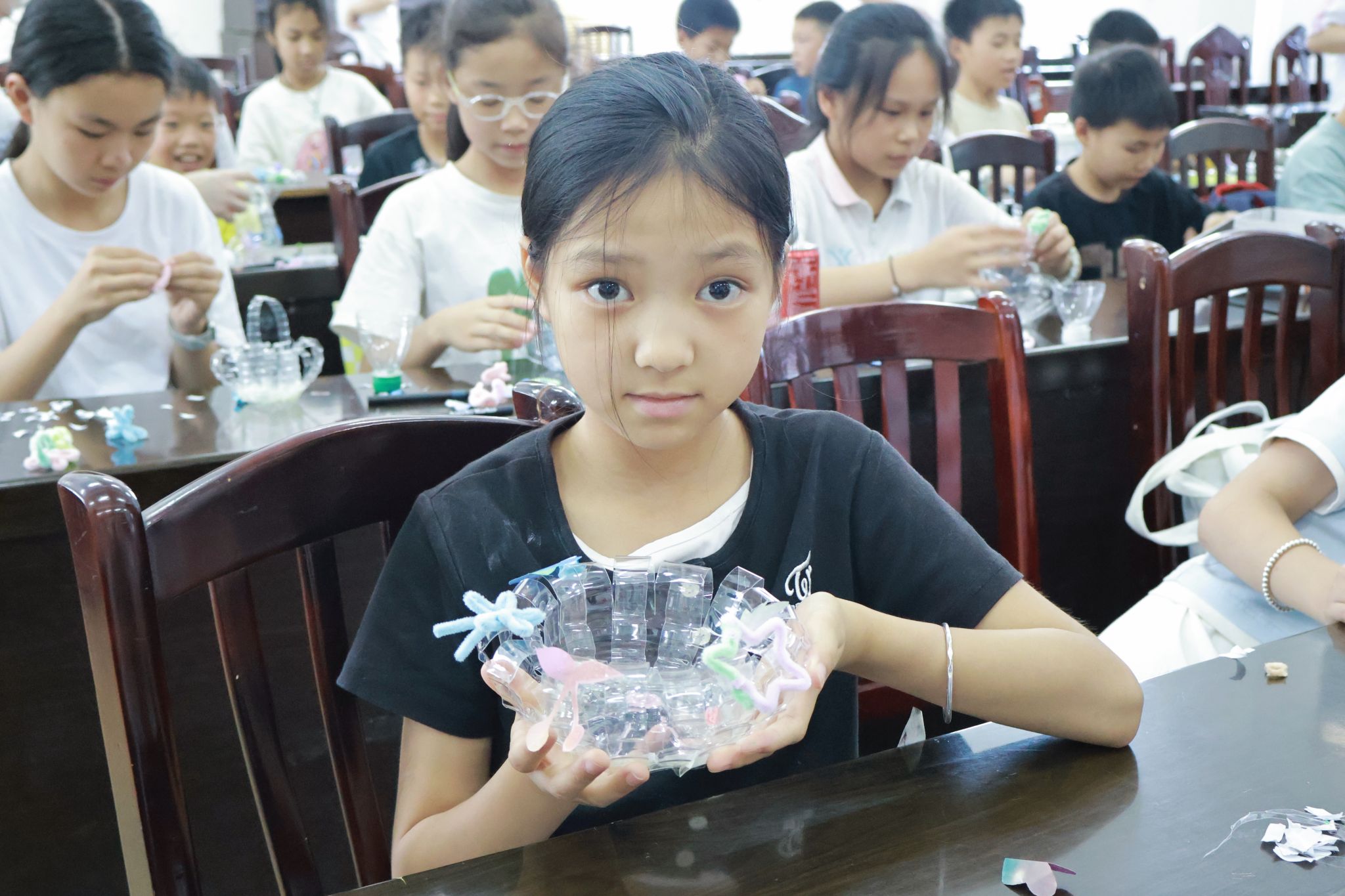 学生展示塑料花篮作品