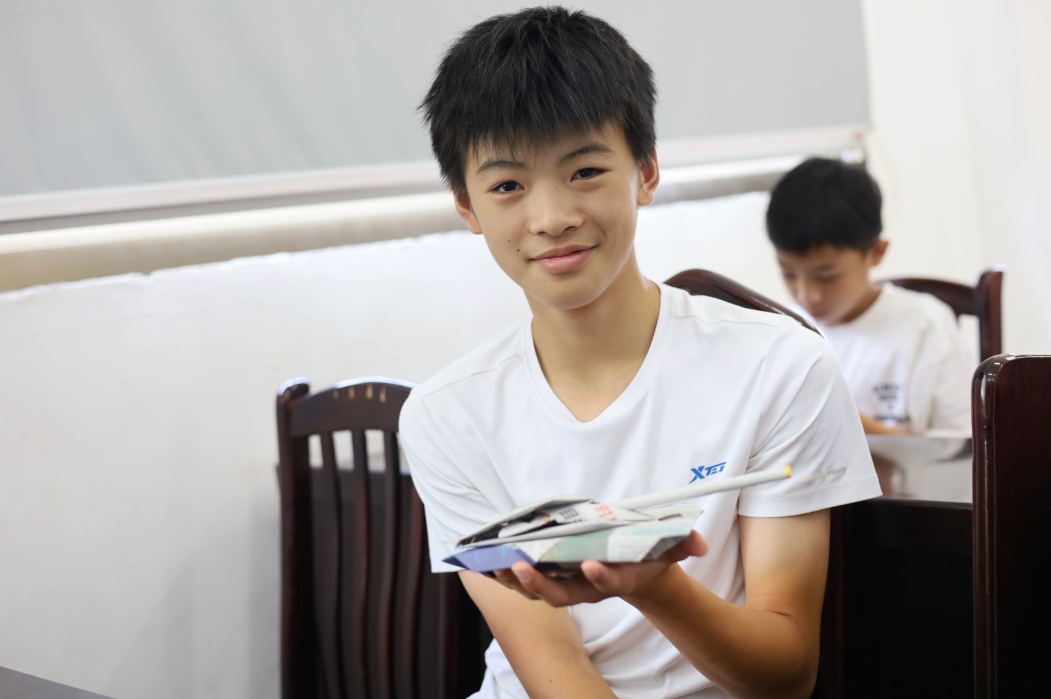 学生展示纸坦克作品