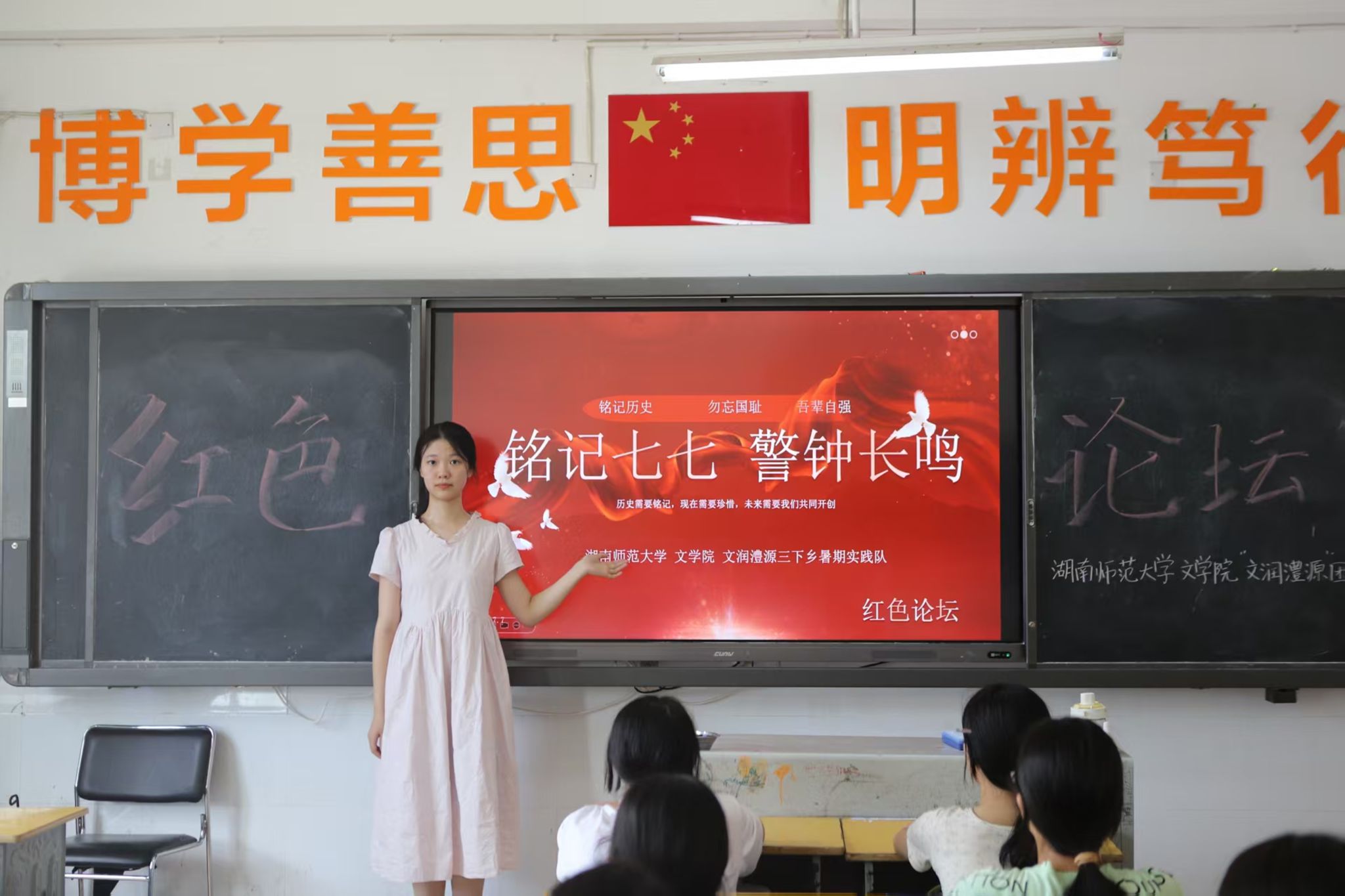 (通讯员 吕知函 麦斯塔乃·雪拉提)为弘扬伟大抗战精神,厚植学生爱国情怀,在七七事变爆发八十八周年之际,7月7日下午,文学院“文润澧源”暑期实践团在桑植县思源实验学校举办“缅怀先烈,铭记历史”红色主题教育论坛。实践团成员朱靖熙担任此次论坛的主讲人。
