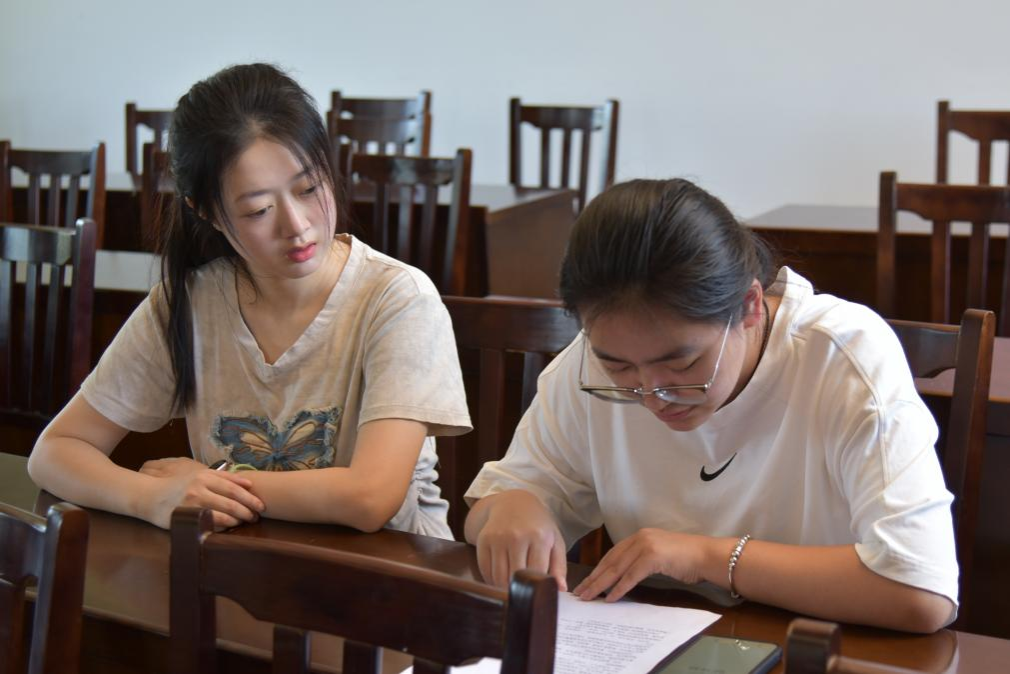 实践团成员与大学生交流录制方言广播