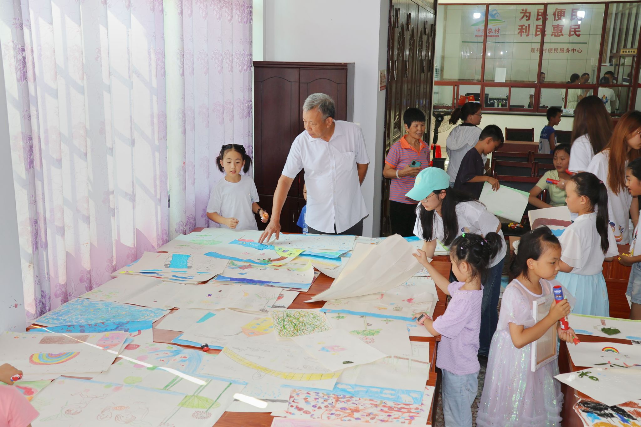 孩子们和家长共同参观绘画课程展