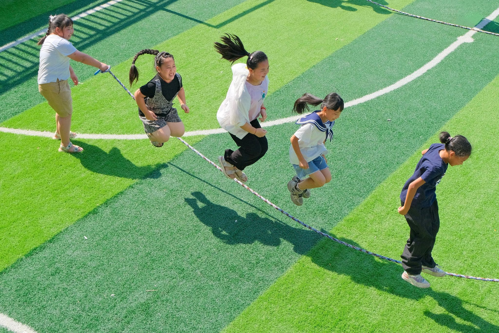 大班学生在运动会结束后进行跳绳运动