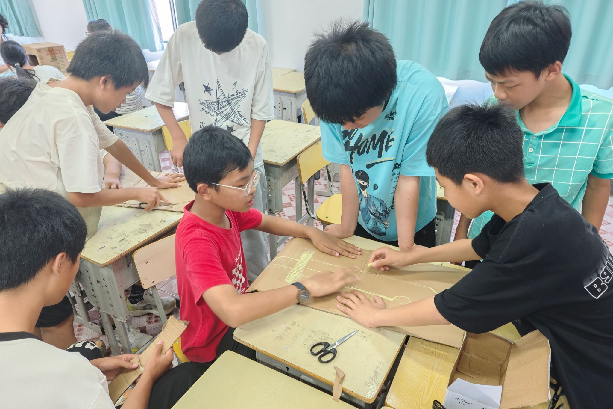 此次课程中所用到的纸板材料为废旧纸板,这种回收并利用废品的做法能够让孩子们切身感受到“废品变宝”的魅力。在手工课上,实践团成员向同学们展示了需要制作的铁皮人和剑,样品外形激发了同学们的创作兴趣。实践团成员向同学们讲解了制作方法和注意事项,让孩子们不必拘泥于给定的方法,可以自由地发挥想象力与创造力,制作出独特的作品。在实践团成员的带领下,同学们积极参与,分工明确,三个创作小组分别负责制作铁皮人的头部,身体和剑,课堂氛围轻松愉悦。经过实践团成员和孩子们的共同努力,成功制作出了铁皮人与利剑。