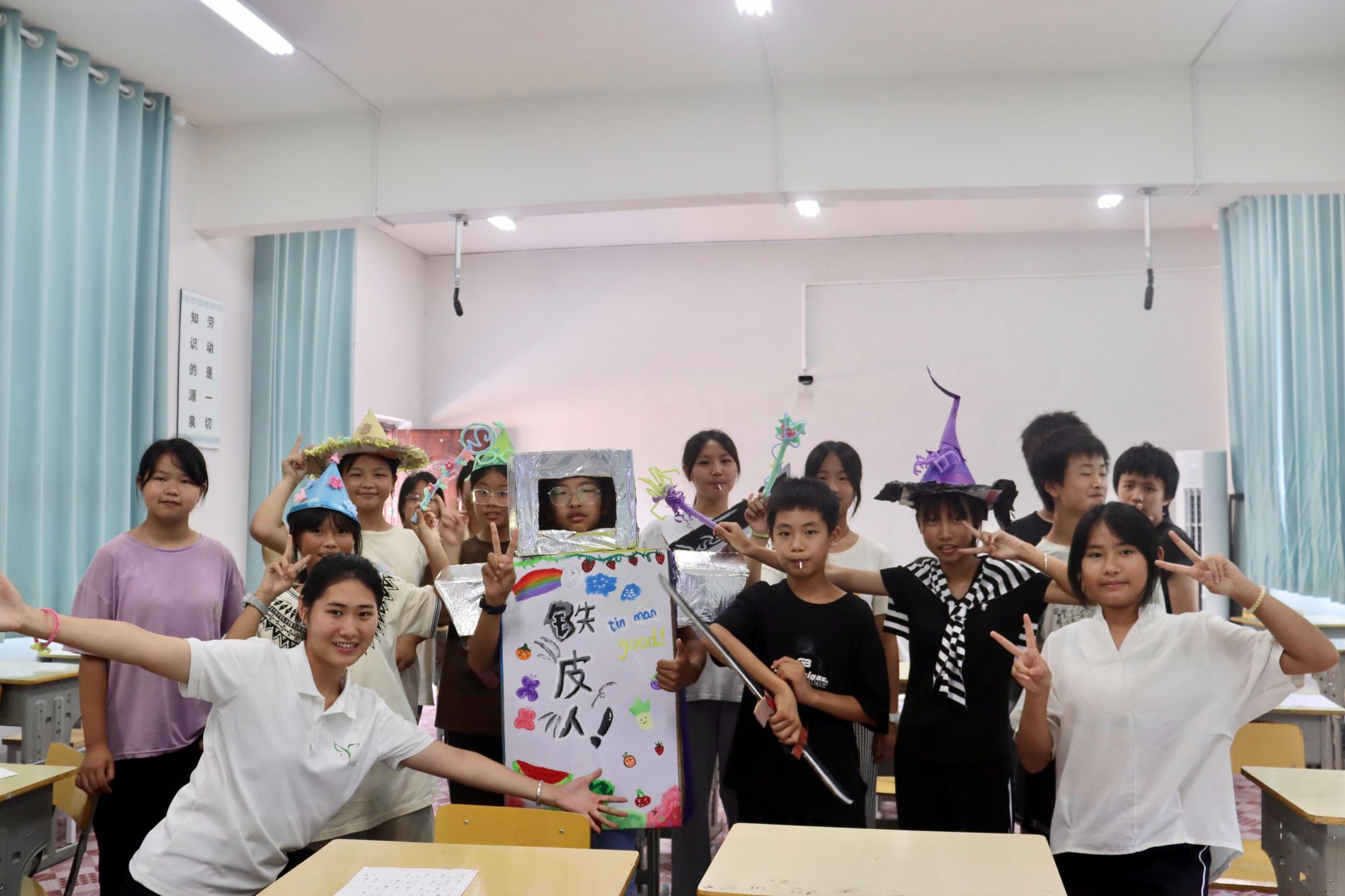 实践团成员带领学生制作铁皮人身体
