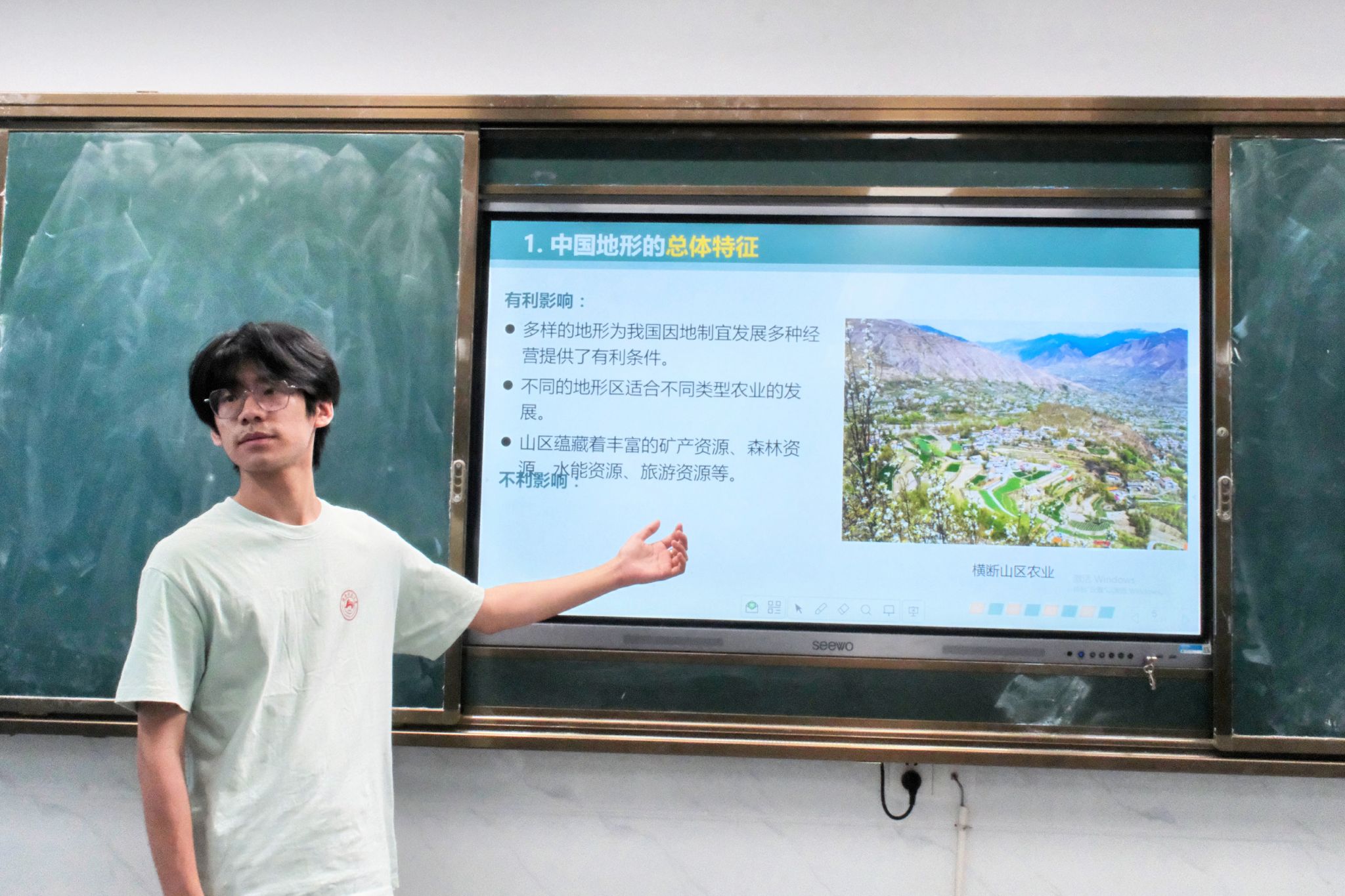 以此为基础,他还系统阐述了我国西高东低、呈三级阶梯分布的主要地势特征,并介绍了各类地形单元如山地、平原、高原等的基本概念与其代表区域。课程设计将重点明确的地理概念传递与趣味感知有机结合。教学成果反馈显示,同学们在课程结束后能够较为准确地指出祖国各地的大致地形。